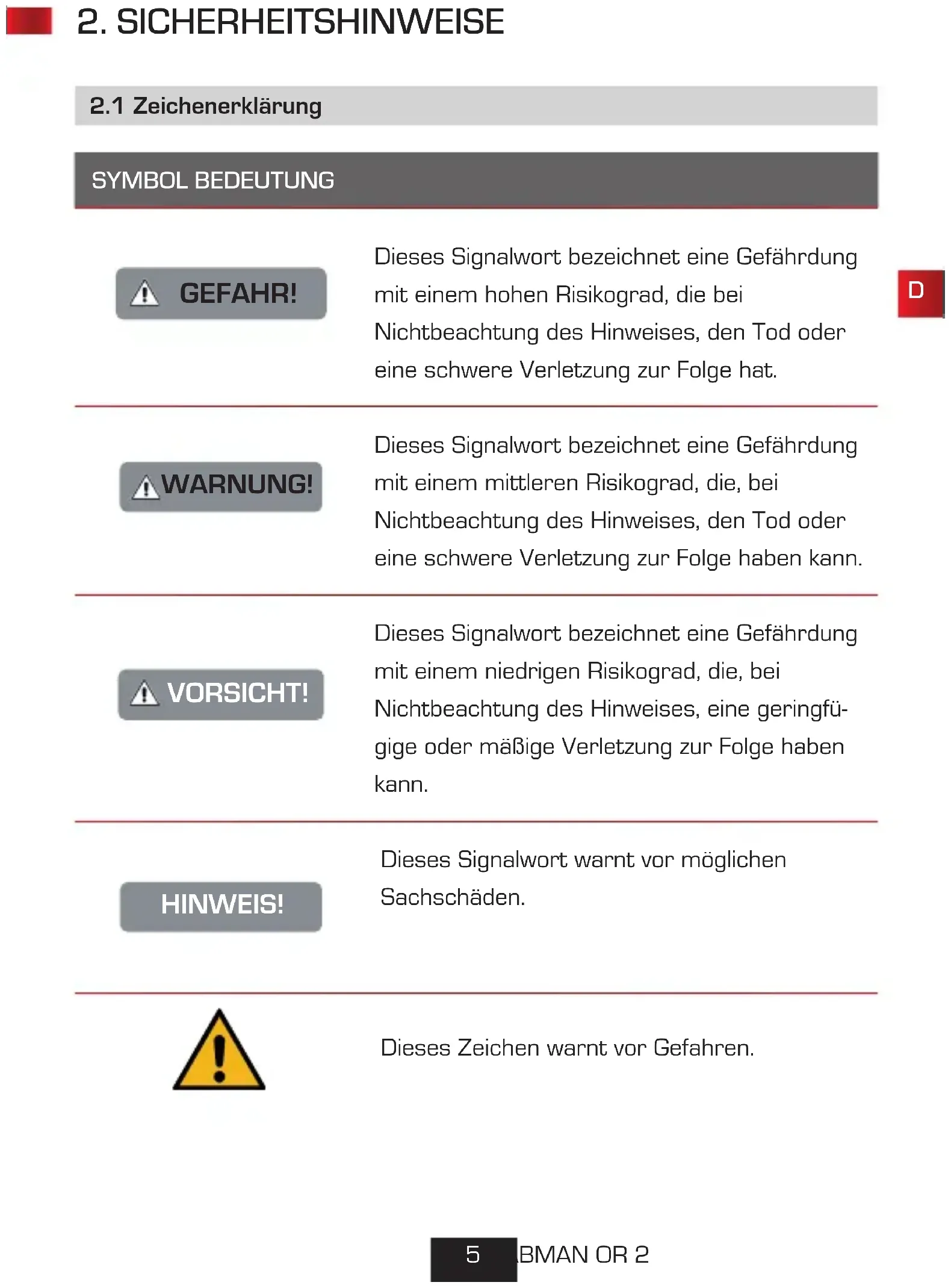 SYMBOL BEDEUTUNG GEFAHR! Dieses Signalwort bezeichnet eine Gefährdung mit einem hohen Risikograd, die bei Nichtbeachtung des Hinweises, den Tod oder eine schwere Verletzung zur Folge hat. WARNUNG! Dieses Signalwort bezeichnet eine Gefährdung mit einem mittleren Risikograd, die, bei Nichtbeachtung des Hinweises, den Tod oder eine schwere Verletzung zur Folge haben kann. VORSICHT! Dieses Signalwort bezeichnet eine Gefährdung mit einem niedrigen Risikograd, die, bei Nichtbeachtung des Hinweises, eine geringfü-gige oder mäßige Verletzung zur Folge haben kann. HINWEIS! Dieses Signalwort warnt vor möglichen Sachschäden.Dieses Zeichen warnt vor Gefahren. 2.1 ZeichenerklärungD 76Bedienungsanleitung