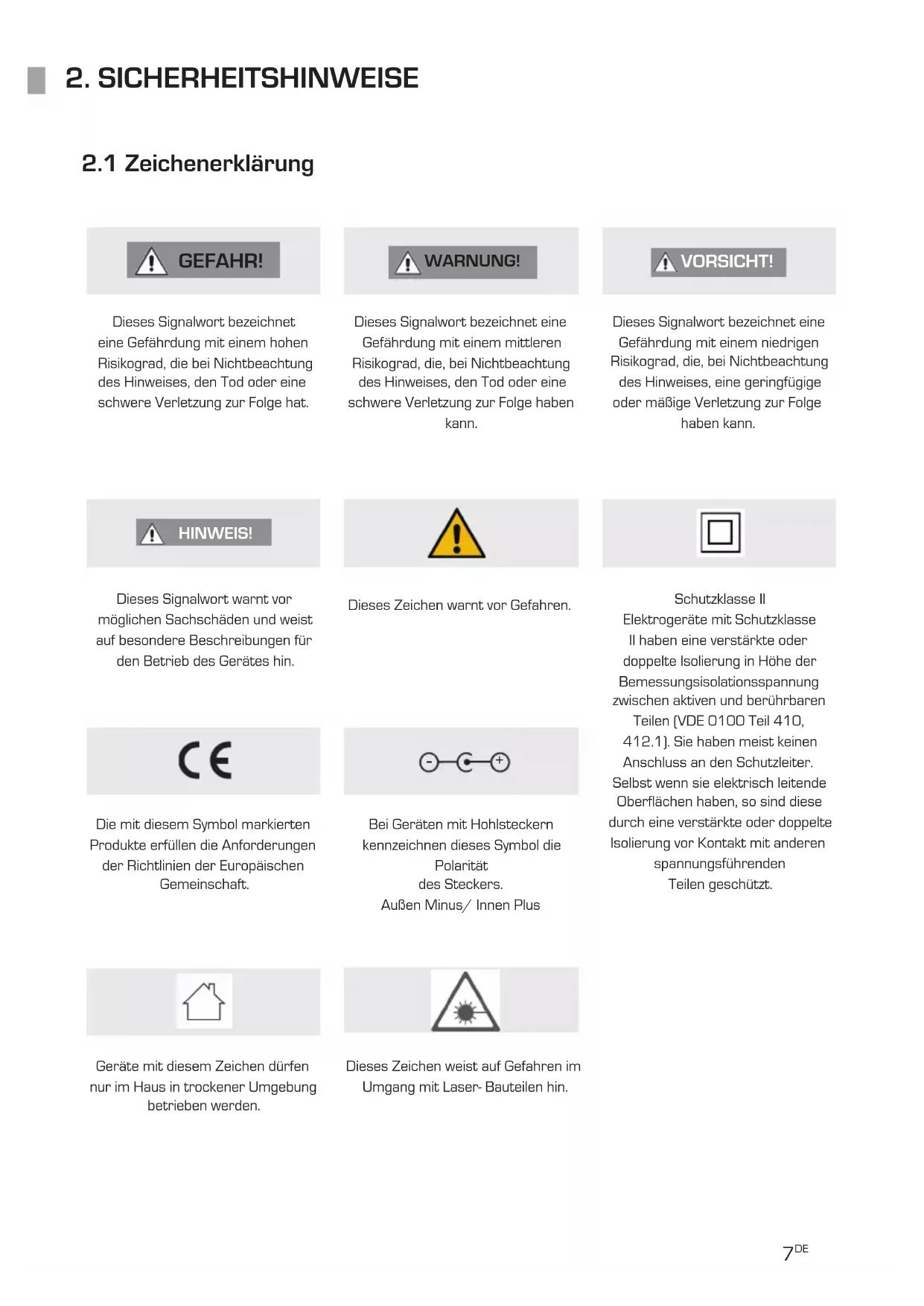 Dieses Signalwort bezeichneteine Gefährdung mit einem hohenRisikograd, die bei Nichtbeachtungdes Hinweises, den Tod oder eineschwere Verletzung zur Folge hat.Dieses Signalwort warnt vormöglichen Sachschäden und weistauf besondere Beschreibungen fürden Betrieb des Gerätes hin.Dieses Signalwort bezeichnet eineGefährdung mit einem mittlerenRisikograd, die, bei Nichtbeachtungdes Hinweises, den Tod oder eineschwere Verletzung zur Folge haben kann.Dieses Zeichen warnt vor Gefahren.Dieses Signalwort bezeichnet eineGefährdung mit einem niedrigenRisikograd, die, bei Nichtbeachtungdes Hinweises, eine geringfügigeoder mäßige Verletzung zur Folgehaben kann.Schutzklasse IIElektrogeräte mit SchutzklasseII haben eine verstärkte oderdoppelte Isolierung in Höhe derBemessungsisolationsspannungzwischen aktiven und berührbarenTeilen (VDE 0100 Teil 410, 412.1). Sie haben meist keinen Anschluss an den Schutzleiter. Selbst wenn sie elektrisch leitende Oberflächen haben, so sind diese durch eine verstärkte oder doppelte Isolierung vor Kontakt mit anderen spannungsführendenTeilen geschützt.