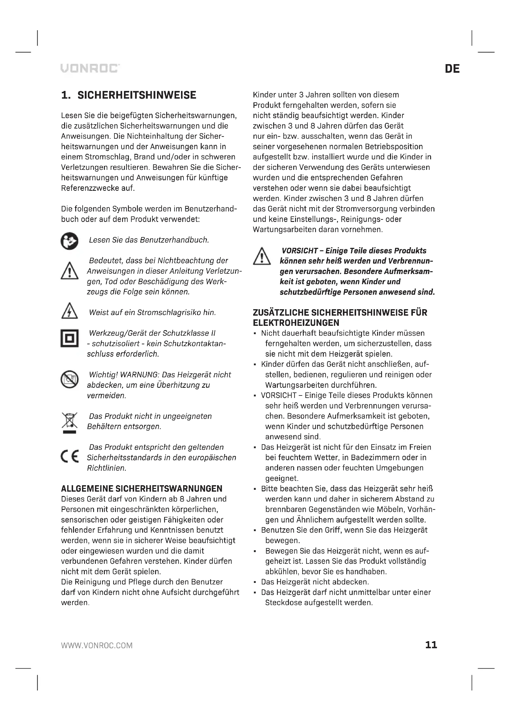Lesen Sie die beigefügten Sicherheitswarnungen, die zusätzlichen Sicherheitswarnungen und die Anweisungen. Die Nichteinhaltung der Sicher- heitswarnungen und der Anweisungen kann in einem Stromschlag, Brand und/oder in schweren Verletzungen resultieren. Bewahren Sie die Sicher- heitswarnungen und Anweisungen für künftige Referenzzwecke auf. Die folgenden Symbole werden im Benutzerhand- buch oder auf dem Produkt verwendet: Lesen Sie das Benutzerhandbuch. Bedeutet, dass bei Nichtbeachtung der Anweisungen in dieser Anleitung Verletzun- gen, Tod oder Beschädigung des Werk- zeugs die Folge sein können. Weist auf ein Stromschlagrisiko hin. Werkzeug/Gerät der Schutzklasse II - schutzisoliert - kein Schutzkontaktan- schluss erforderlich. Wichtig! WARNUNG: Das Heizgerät nicht abdecken, um eine Überhitzung zu vermeiden. Das Produkt nicht in ungeeigneten Behältern entsorgen. Das Produkt entspricht den geltenden Sicherheitsstandards in den europäischen Richtlinien. ALLGEMEINE SICHERHEITSWARNUNGEN Dieses Gerät darf von Kindern ab 8Jahren und Personen mit eingeschränkten körperlichen, sensorischen oder geistigen Fähigkeiten oder fehlender Erfahrung und Kenntnissen benutzt werden, wenn sie in sicherer Weise beaufsichtigt oder eingewiesen wurden und die damit verbundenen Gefahren verstehen. Kinder dürfen nicht mit dem Gerät spielen. Die Reinigung und Pflege durch den Benutzer darf von Kindern nicht ohne Aufsicht durchgeführt werden. Kinder unter 3Jahren sollten von diesem Produkt ferngehalten werden, sofern sie nicht ständig beaufsichtigt werden. Kinder zwischen 3 und 8Jahren dürfen das Gerät nur ein- bzw. ausschalten, wenn das Gerät in seiner vorgesehenen normalen Betriebsposition aufgestellt bzw. installiert wurde und die Kinder in der sicheren Verwendung des Geräts unterwiesen wurden und die entsprechenden Gefahren verstehen oder wenn sie dabei beaufsichtigt werden. Kinder zwischen 3 und 8 Jahren dürfen das Gerät nicht mit der Stromversorgung verbinden und keine Einstellungs-, Reinigungs- oder Wartungsarbeiten daran vornehmen. VORSICHT – Einige Teile dieses Produkts können sehr heiß werden und Verbrennun- gen verursachen. Besondere Aufmerksam- keit ist geboten, wenn Kinder und schutzbedürftige Personen anwesend sind.