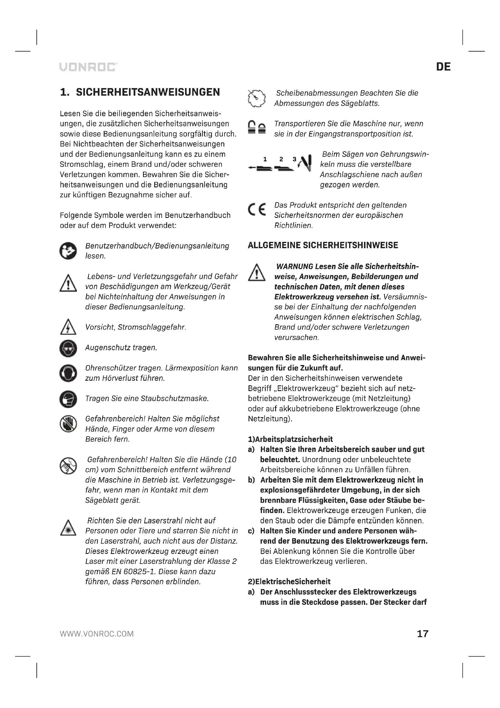 Lesen Sie die beiliegenden Sicherheitsanweis- ungen, die zusätzlichen Sicherheitsanweisungen sowie diese Bedienungsanleitung sorgfältig durch. Bei Nichtbeachten der Sicherheitsanweisungen und der Bedienungsanleitung kann es zu einem Stromschlag, einem Brand und/oder schweren Verletzungen kommen. Bewahren Sie die Sicher- heitsanweisungen und die Bedienungsanleitung zur künftigen Bezugnahme sicher auf. Folgende Symbole werden im Benutzerhandbuch oder auf dem Produkt verwendet: Benutzerhandbuch/Bedienungsanleitung lesen. Lebens- und Verletzungsgefahr und Gefahr von Beschädigungen am Werkzeug/Gerät bei Nichteinhaltung der Anweisungen in dieser Bedienungsanleitung. Vorsicht, Stromschlaggefahr. Augenschutz tragen. Ohrenschützer tragen. Lärmexposition kann zum Hörverlust führen. Tragen Sie eine Staubschutzmaske. Gefahrenbereich! Halten Sie möglichst Hände, Finger oder Arme von diesem Bereich fern. Gefahrenbereich! Halten Sie die Hände (10 cm) vom Schnittbereich entfernt während die Maschine in Betrieb ist. Verletzungsge- fahr, wenn man in Kontakt mit dem Sägeblatt gerät. Richten Sie den Laserstrahl nicht auf Personen oder Tiere und starren Sie nicht in den Laserstrahl, auch nicht aus der Distanz. Dieses Elektrowerkzeug erzeugt einen Laser mit einer Laserstrahlung der Klasse 2 gemäß EN 60825-1. Diese kann dazu führen, dass Personen erblinden. Scheibenabmessungen Beachten Sie die Abmessungen des Sägeblatts. Transportieren Sie die Maschine nur, wenn sie in der Eingangstransportposition ist.