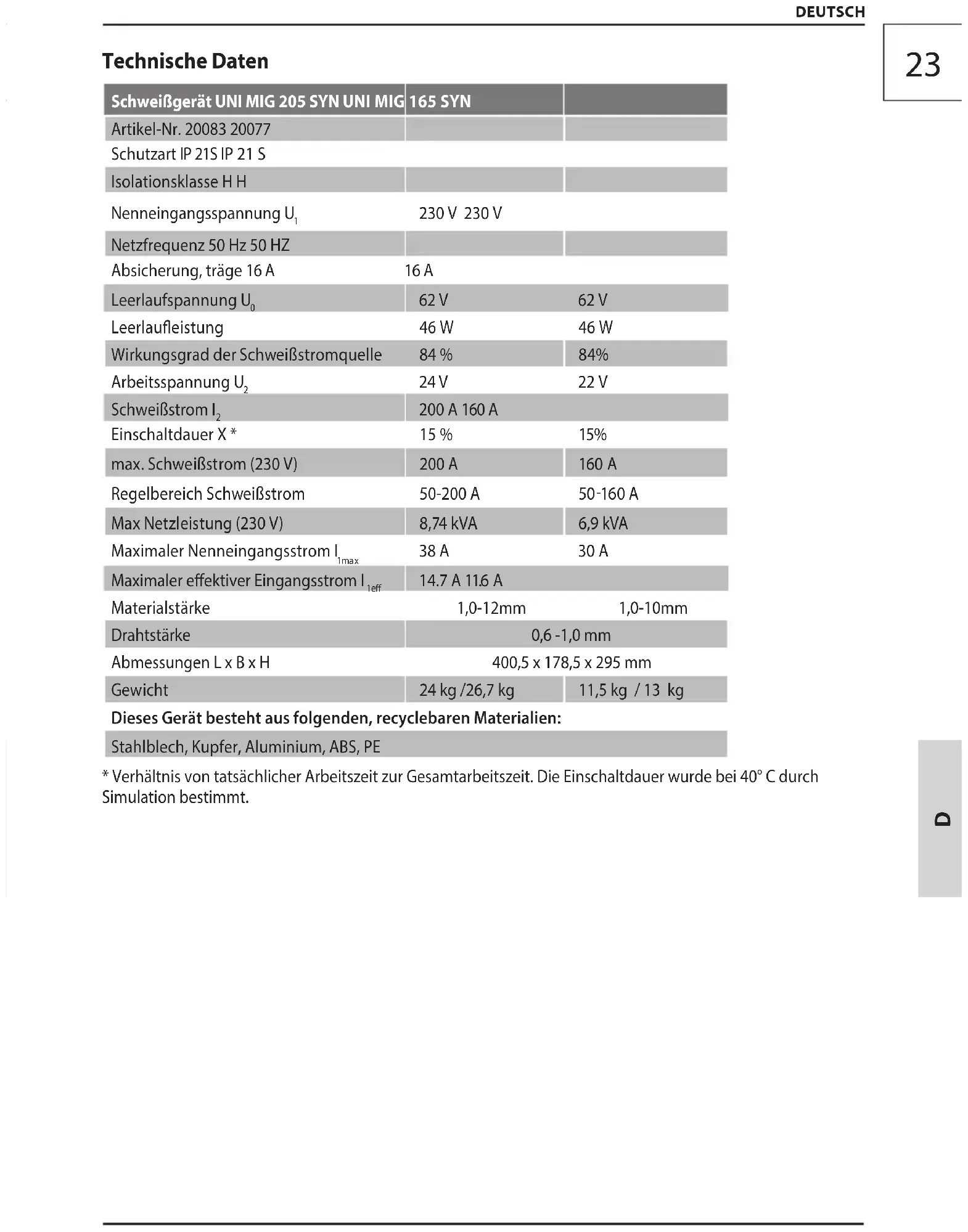 DEUTSCH Technische Daten Schweißgerät UNI MIG 205 SYN UNI MIG 165 SYN Artikel-Nr. 20083 20077 Schutzart IP 21S IP 21 S Isolationsklasse H H Nenneingangsspannung U