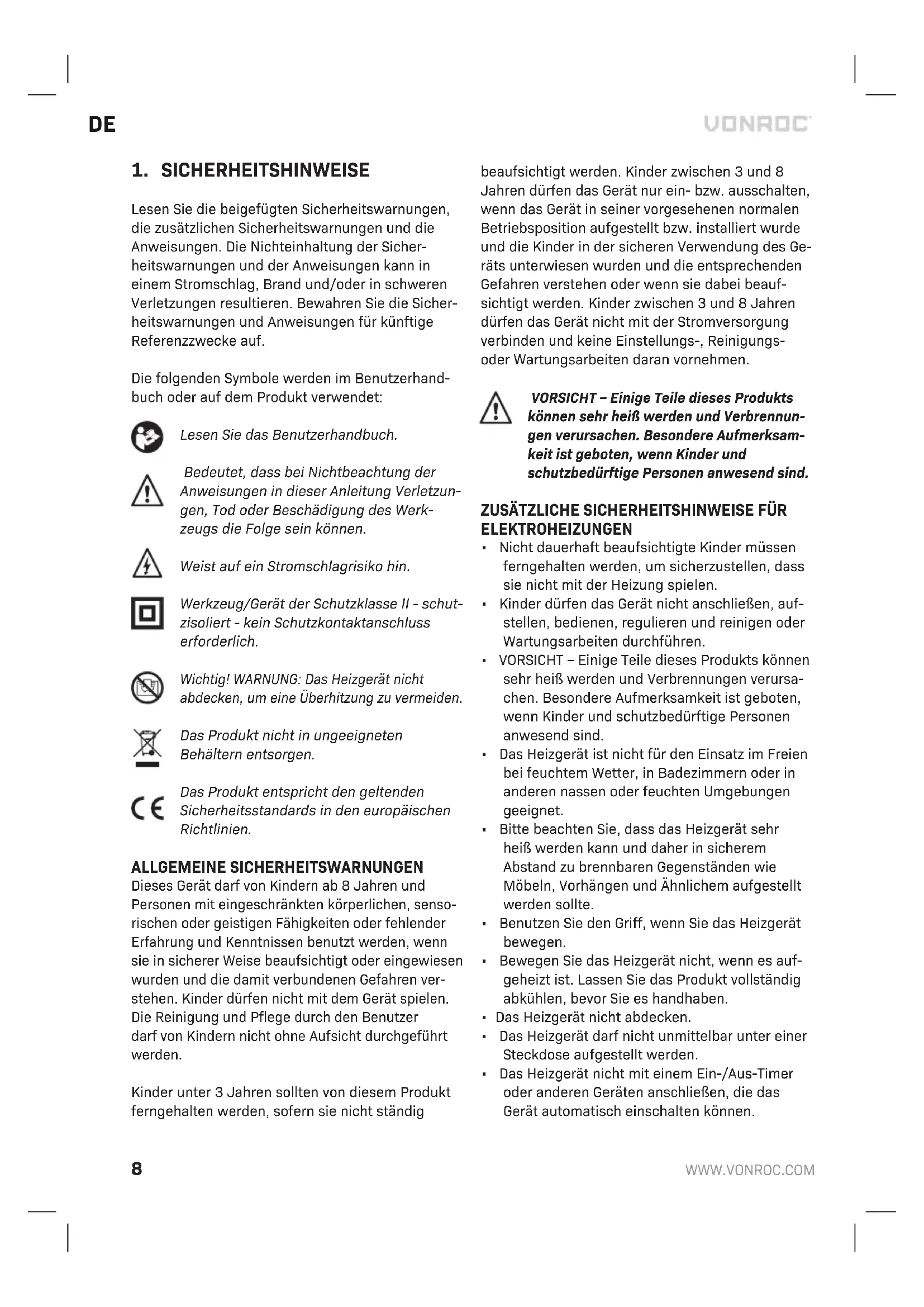 Lesen Sie die beigefügten Sicherheitswarnungen, die zusätzlichen Sicherheitswarnungen und die Anweisungen. Die Nichteinhaltung der Sicher- heitswarnungen und der Anweisungen kann in einem Stromschlag, Brand und/oder in schweren Verletzungen resultieren. Bewahren Sie die Sicher- heitswarnungen und Anweisungen für künftige Referenzzwecke auf. Die folgenden Symbole werden im Benutzerhand- buch oder auf dem Produkt verwendet: Lesen Sie das Benutzerhandbuch. Bedeutet, dass bei Nichtbeachtung der Anweisungen in dieser Anleitung Verletzun- gen, Tod oder Beschädigung des Werk- zeugs die Folge sein können. Weist auf ein Stromschlagrisiko hin. Werkzeug/Gerät der Schutzklasse II - schut- zisoliert - kein Schutzkontaktanschluss erforderlich. Wichtig! WARNUNG: Das Heizgerät nicht abdecken, um eine Überhitzung zu vermeiden. Das Produkt nicht in ungeeigneten Behältern entsorgen. Das Produkt entspricht den geltenden Sicherheitsstandards in den europäischen Richtlinien. ALLGEMEINE SICHERHEITSWARNUNGEN Dieses Gerät darf von Kindern ab 8Jahren und Personen mit eingeschränkten körperlichen, senso- rischen oder geistigen Fähigkeiten oder fehlender Erfahrung und Kenntnissen benutzt werden, wenn sie in sicherer Weise beaufsichtigt oder eingewiesen wurden und die damit verbundenen Gefahren ver- stehen. Kinder dürfen nicht mit dem Gerät spielen. Die Reinigung und Pflege durch den Benutzer darf von Kindern nicht ohne Aufsicht durchgeführt werden. Kinder unter 3Jahren sollten von diesem Produkt ferngehalten werden, sofern sie nicht ständig beaufsichtigt werden. Kinder zwischen 3 und 8 Jahren dürfen das Gerät nur ein- bzw. ausschalten, wenn das Gerät in seiner vorgesehenen normalen Betriebsposition aufgestellt bzw. installiert wurde und die Kinder in der sicheren Verwendung des Ge- räts unterwiesen wurden und die entsprechenden Gefahren verstehen oder wenn sie dabei beauf- sichtigt werden. Kinder zwischen 3 und 8 Jahren dürfen das Gerät nicht mit der Stromversorgung verbinden und keine Einstellungs-, Reinigungs- oder Wartungsarbeiten daran vornehmen. VORSICHT – Einige Teile dieses Produkts können sehr heiß werden und Verbrennun- gen verursachen. Besondere Aufmerksam- keit ist geboten, wenn Kinder und schutzbedürftige Personen anwesend sind.