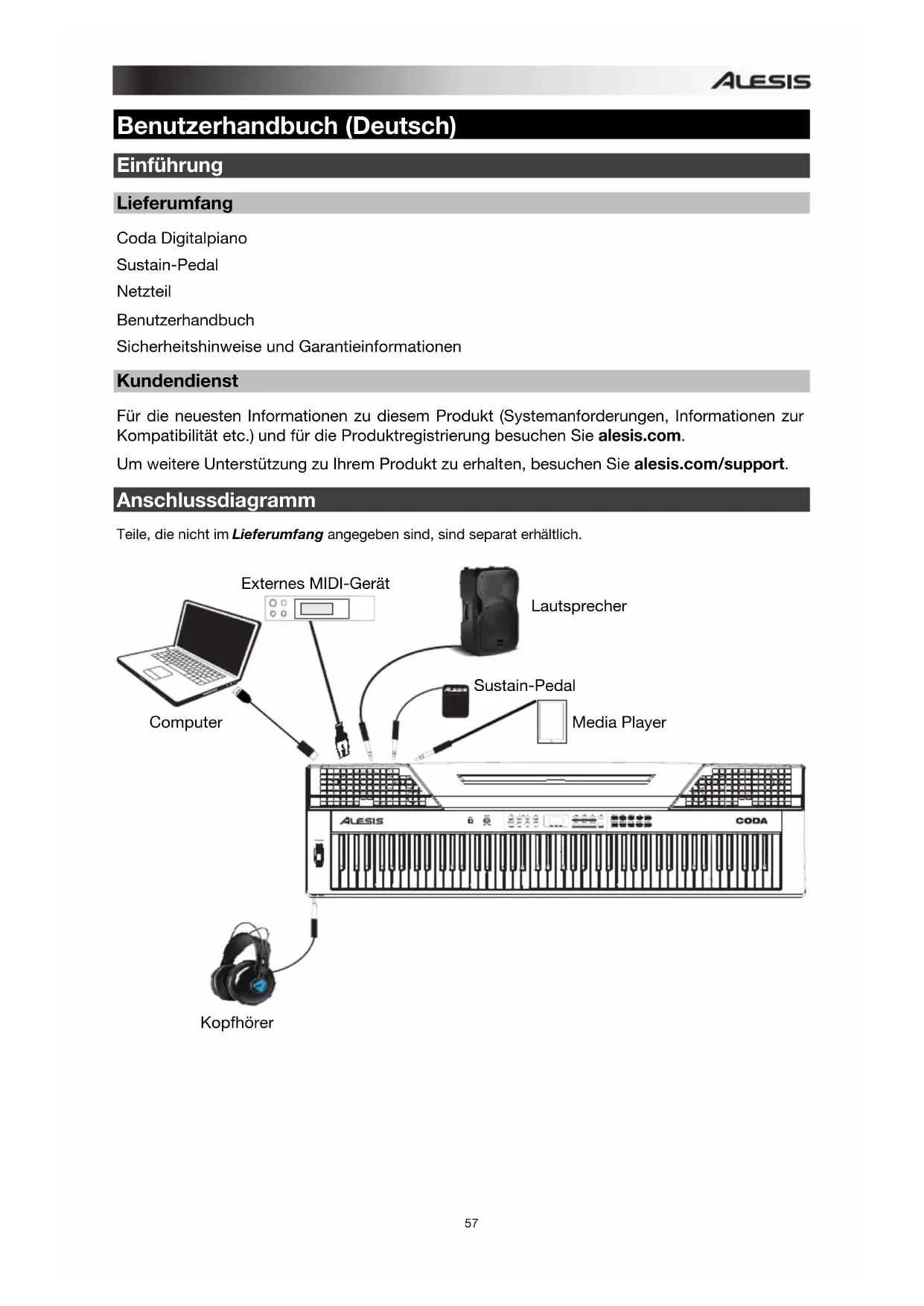 Parametro Tipo di scala 1 Pitagorica 2 Pure Major 3 Pure Minor 4 Meantone 5 Werckmeister 6 Kirnberger57 PITCH BEND Benutzerhandbuch (Deutsch) Einführung Lieferumfang Coda Digitalpiano Sustain-Pedal Netzteil Benutzerhandbuch Sicherheitshinweise und Garantieinformationen Kundendienst Für die neuesten Informationen zu diesem Produkt (Systemanforderungen, Informationen zur Kompatibilität etc.) und für die Produktregistrierung besuchen Sie alesis.com. Um weitere Unterstützung zu Ihrem Produkt zu erhalten, besuchen Sie alesis.com/support. Anschlussdiagramm Teile, die nicht im Lieferumfang angegeben sind, sind separat erhältlich.