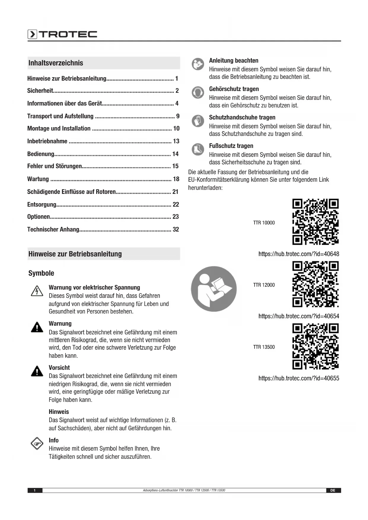 - Technischer Anhang Hinweise zur Betriebsanleitung Symbole Warnung vor elektrischer Spannung Dieses Symbol weist darauf hin, dass Gefahren aufgrund von elektrischer Spannung für Leben und Gesundheit von Personen bestehen. Warnung Das Signalwort bezeichnet eine Gefährdung mit einem mittleren Risikograd, die, wenn sie nicht vermieden wird, den Tod oder eine schwere Verletzung zur Folge haben kann. Vorsicht Das Signalwort bezeichnet eine Gefährdung mit einem niedrigen Risikograd, die, wenn sie nicht vermieden wird, eine geringfügige oder mäßige Verletzung zur Folge haben kann. Hinweis Das Signalwort weist auf wichtige Informationen (z. B. auf Sachschäden), aber nicht auf Gefährdungen hin. Info Hinweise mit diesem Symbol helfen Ihnen, Ihre Tätigkeiten schnell und sicher auszuführen. Anleitung beachten Hinweise mit diesem Symbol weisen Sie darauf hin, dass die Betriebsanleitung zu beachten ist. Gehörschutz tragen Hinweise mit diesem Symbol weisen Sie darauf hin, dass ein Gehörschutz zu benutzen ist. Schutzhandschuhe tragen Hinweise mit diesem Symbol weisen Sie darauf hin, dass Schutzhandschuhe zu tragen sind. Fußschutz tragen Hinweise mit diesem Symbol weisen Sie darauf hin, dass Sicherheitsschuhe zu tragen sind. Die aktuelle Fassung der Betriebsanleitung und die EU-Konformitätserklärung können Sie unter folgendem Link herunterladen: TTR 10000 https://hub.trotec.com/?id=40648 TTR 12000 https://hub.trotec.com/?id=40654 TTR 13500 https://hub.trotec.com/?id=40655DE 2 Adsorptions-Luftentfeuchter TTR 10000 / TTR 12000 / TTR 13500 Sicherheit Lesen Sie diese Anleitung vor Inbetriebnahme / Verwendung des Gerätes sorgfältig durch und bewahren Sie die Anleitung immer in unmittelbarer Nähe des Aufstellortes bzw. am Gerät auf! Warnung Lesen Sie alle Sicherheitshinweise und Anweisungen. Versäumnisse bei der Einhaltung der Sicherheitshinweise und Anweisungen können elektrischen Schlag, Brand und/ oder schwere Verletzungen verursachen. Bewahren Sie alle Sicherheitshinweise und Anweisungen für die Zukunft auf. p. 32