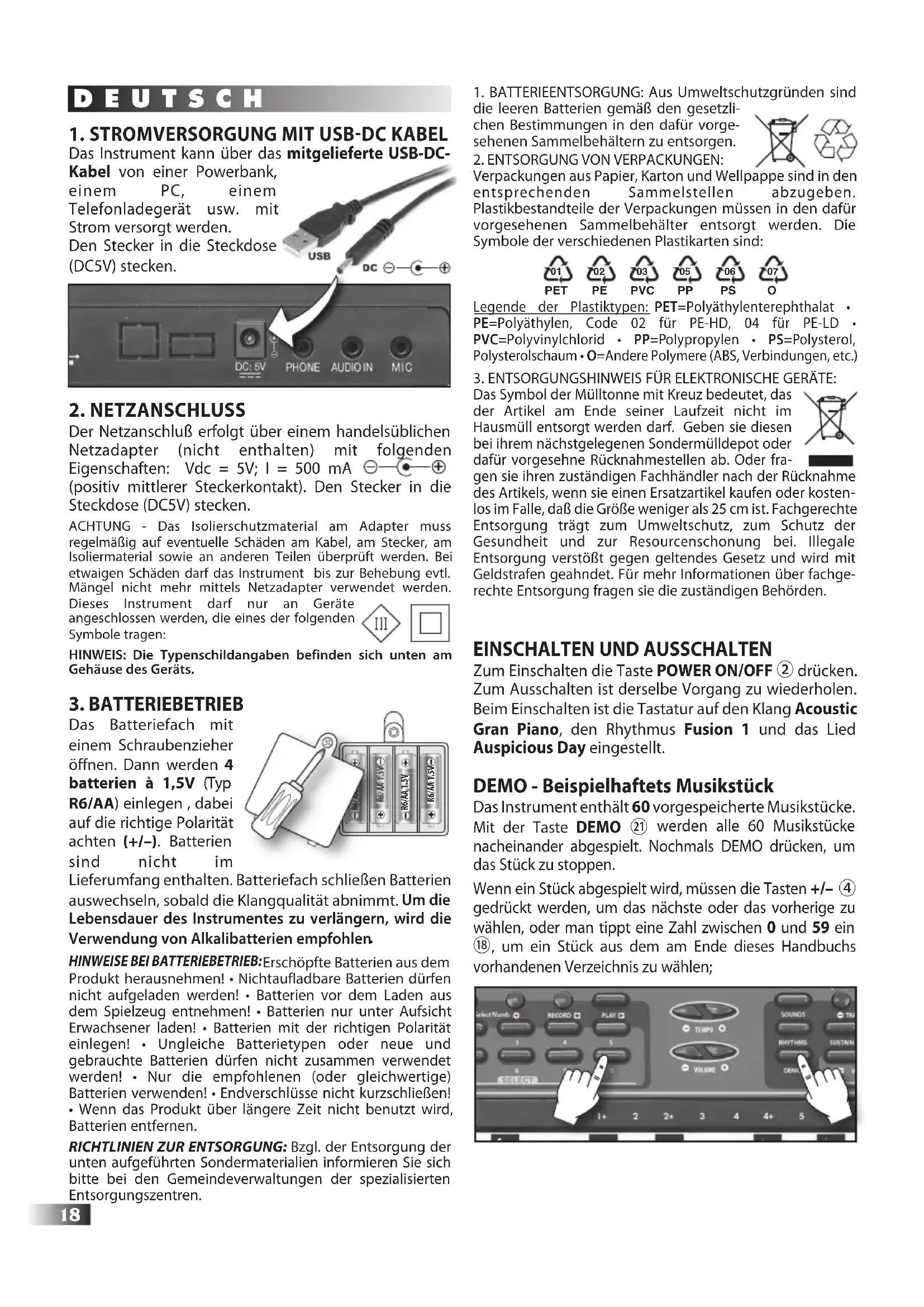Das Batteriefach mit einem Schraubenzieher öffnen. Dann werden 4 batterien à 1,5V (Typ R6/AA) einlegen , dabei auf die richtige Polarität achten (+/–). Batterien sind nicht im Lieferumfang enthalten. Batteriefach schließen Batterien auswechseln, sobald die Klangqualität abnimmt. Um die Lebensdauer des Instrumentes zu verlängern, wird die Verwendung von Alkalibatterien empfohlen HINWEISE BEI BATTERIEBETRIEB: Erschöpfte Batterien aus dem Produkt herausnehmen! • Nichtaufladbare Batterien dürfen nicht aufgeladen werden! • Batterien vor dem Laden aus dem Spielzeug entnehmen! • Batterien nur unter Aufsicht Erwachsener laden! • Batterien mit der richtigen Polarität einlegen! • Ungleiche Batterietypen oder neue und gebrauchte Batterien dürfen nicht zusammen verwendet werden! • Nur die empfohlenen (oder gleichwertige) Batterien verwenden! • Endverschlüsse nicht kurzschließen! • Wenn das Produkt über längere Zeit nicht benutzt wird, Batterien entfernen.RICHTLINIEN ZUR ENTSORGUNG: Bzgl. der Entsorgung der unten aufgeführten Sondermaterialien informieren Sie sich bitte bei den Gemeindeverwaltungen der spezialisierten Entsorgungszentren. 1. BATTERIEENTSORGUNG: Aus Umweltschutzgründen sind die leeren Batterien gemäß den gesetzli-chen Bestimmungen in den dafür vorge-sehenen Sammelbehältern zu entsorgen.2. ENTSORGUNG VON VERPACKUNGEN:Verpackungen aus Papier, Karton und Wellpappe sind in den entsprechenden Sammelstellen abzugeben. Plastikbestandteile der Verpackungen müssen in den dafür vorgesehenen Sammelbehälter entsorgt werden. Die Symbole der verschiedenen Plastikarten sind: Legende der Plastiktypen: PET=Polyäthylenterephthalat • PE=Polyäthylen, Code 02 für PE-HD, 04 für PE-LD • PVC=Polyvinylchlorid • PP=Polypropylen • PS=Polysterol, Polysterolschaum • O=Andere Polymere (ABS, Verbindungen, etc.)3. ENTSORGUNGSHINWEIS FÜR ELEKTRONISCHE GERÄTE:Das Symbol der Mülltonne mit Kreuz bedeutet, das der Artikel am Ende seiner Laufzeit nicht im Hausmüll entsorgt werden darf. Geben sie diesen bei ihrem nächstgelegenen Sondermülldepot oder dafür vorgesehne Rücknahmestellen ab. Oder fra gen sie ihren zuständigen Fachhändler nach der Rücknahme des Artikels, wenn sie einen Ersatzartikel kaufen oder kosten los im Falle, daß die Größe weniger als 25 cm ist. Fachgerechte Entsorgung trägt zum Umweltschutz, zum Schutz der Gesundheit und zur Resourcenschonung bei. Illegale Entsorgung verstößt gegen geltendes Gesetz und wird mit Geldstrafen geahndet. Für mehr Informationen über fachge rechte Entsorgung fragen sie die zuständigen Behörden.
