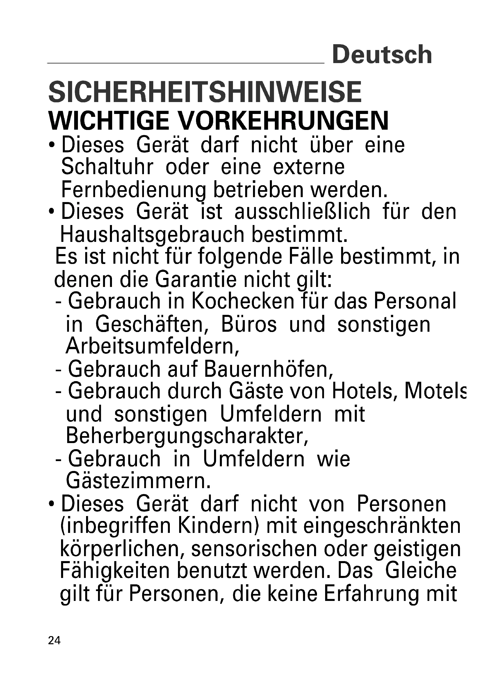 - Dieses Gerät darf nicht von Personen (inbegriffen Kindern) mit eingeschränkten körperlichen, sensorischen oder geistigen Fähigkeiten benutzt werden. Das Gleiche gilt für Personen, die keine Erfahrung mit25 dem Gerät besitzen oder sich mit ihm nicht auskennen, außer wenn sie von einer für ihre Sicherheit verantwortlichen Person beaufsichtigt werden oder von dieser mit dem Gebrauch des Gerätes vertraut gemacht wurden.