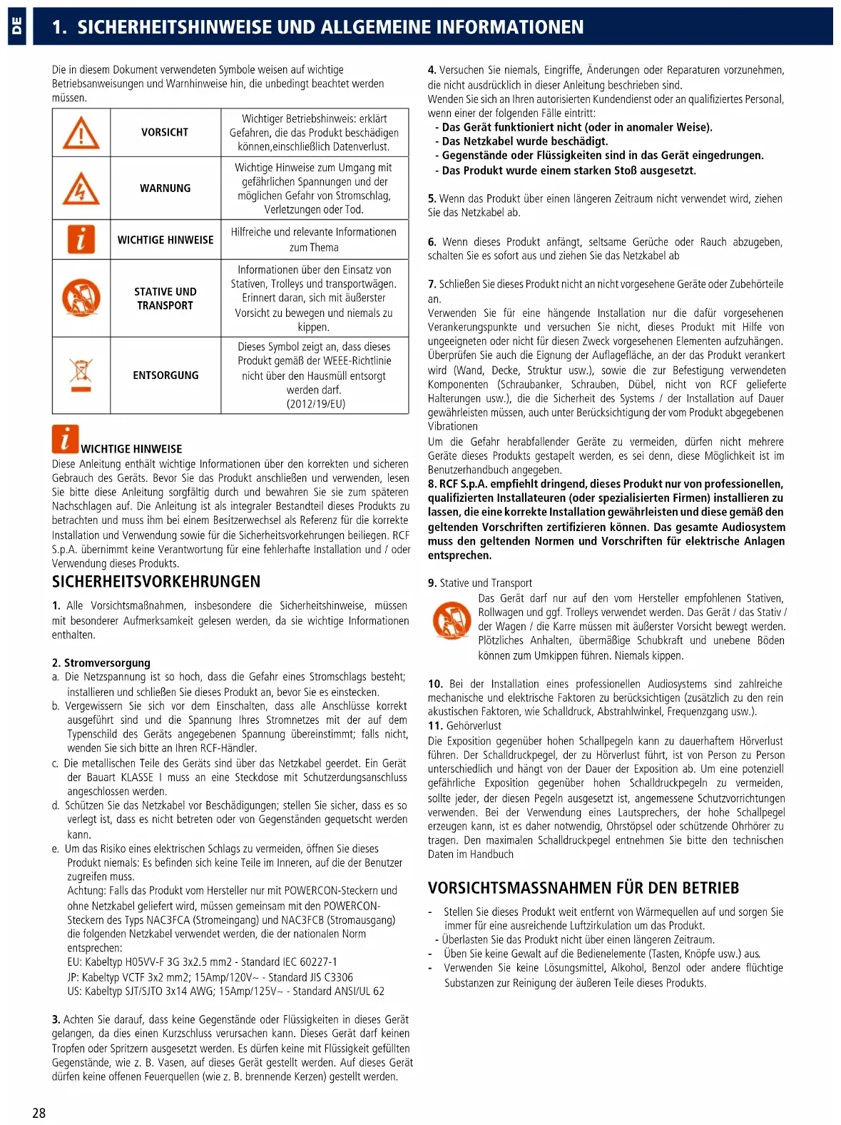 Informationen über den Einsatz von Stativen, Trolleys und transportwägen. Erinnert daran, sich mit äußerster Vorsicht zu bewegen und niemals zu kippen. ENTSORGUNG Dieses Symbol zeigt an, dass dieses Produkt gemäß der WEEE-Richtlinie nicht über den Hausmüll entsorgt werden darf. (2012/19/EU) WICHTIGE HINWEISE Diese Anleitung enthält wichtige Informationen über den korrekten und sicheren Gebrauch des Geräts. Bevor Sie das Produkt anschließen und verwenden, lesen Sie bitte diese Anleitung sorgfältig durch und bewahren Sie sie zum späteren Nachschlagen auf. Die Anleitung ist als integraler Bestandteil dieses Produkts zu betrachten und muss ihm bei einem Besitzerwechsel als Referenz für die korrekte Installation und Verwendung sowie für die Sicherheitsvorkehrungen beiliegen. RCF S.p.A. übernimmt keine Verantwortung für eine fehlerhafte Installation und / oder Verwendung dieses Produkts. SICHERHEITSVORKEHRUNGEN