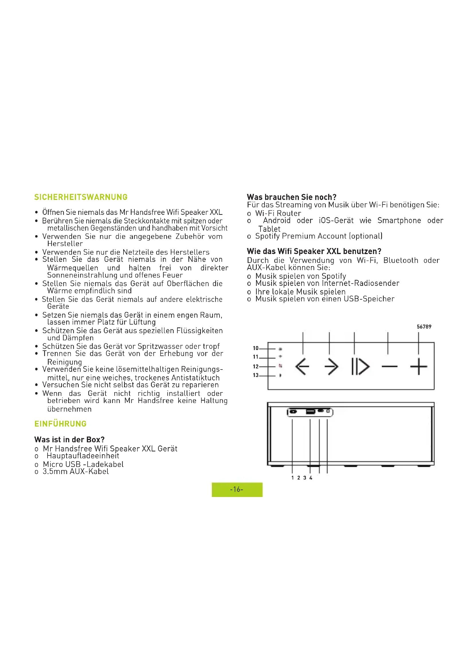 Handsfree Wifi Speaker XXL. Wenn die Wifi Speaker XXL nicht gefunden wird, ist diese möglich noch mit einem anderen Gerät verbunden. Die Paarung Ihrer Geräte wird abgeschlossen sein, wenn die Bluetooth LED Anzeige (13) blau leuchtet. - AUX Modus Sie können auch Musik über das mitgelieferte AUX-Kabel spielen. Stecken Sie das AUX-Kabe“l in das Gerät und in Ihrem Musikgerät. Wählen Sie den AUX-Modus, indem Sie die MODE-Taste (12) drücken. Die LED-Anzeige wird blau, wenn Sie in den AUX-Modus befinden. - USB-Speicher Modus Sie können einen USB-Stick mit MP3-Dateien auf dem USB-Speicheranschluss (4) verbinden um Musik zu spielen. - Internet Radio (nur in Wi-Fi Modus und mit dem Mr Handsfree App) Sie können auch unter Verwendung von TuneIn oder iHeartradio (erfordert einen registrierten Account) Internetradio hören. Suche nach Genre oder Land und wählen Sie Ihre bevorzugte Radiosender. - Spotify Sie können diese App direct mit Spotify nutzen. Um Songs von Ihrem Spotify-Konto zu spielen, klicken Sie einfach auf „Spotify“ im App-Menü um die Verbindung mit Spotify zu machen. (Spotify erfordert ein registriertes Konto) Wenn sie eine kostenlose Spotify-Konto haben, können Sie DLNA-19- oder Airplay verwenden. Sie können auch Musik von Spotify spielen durch Bluetooth oder die AUX- Kabel. - Spotify Premium Funktionen Für bestimmte Spotify-Funktionen, benötigen Sie ein Spotify Premium Konto. Dies kann in der Spotify-App erworben werden. Spotify Premium- Funktionen sind z.B. Super Qualität, Musik offline hören, keiner Werbung, jeden Song auf Nachfrage spielen, ... Sie brauchen auch ein Premium Konto, Spotify auf Wi-Fi-Lautsprechern zu verwenden. APP - Lautsprecher Umbenennen Wählen Sie den Lautsprecher welcher Sie umbenennen möchten und drücken Sie das Einstellungssymbol. Wählen sie „Umbenennen“ und wählen Sie einen der Vorschläge oder personalisieren Sie den Namen Ihres Lautsprecher. - Lautsprecher gruppieren Wählen Sie den Lautsprecher mit einen anderen zu gruppieren. Halten Sie Ihren Finger bis die gestrichelte Linie sichtbar ist und dann Drag & Drop auf den „Master“ Lautsprecher. Um die Gruppierung aufzuheben, Drag & Drop die Lautsprecher aus der Gruppe. Es ist möglich, mehrere Gruppen zu bilden und mehrere Lautsprecher in einer Gruppe zu haben. Wenn Sie die Lautstärke einer Gruppe ändern, wird dies auf alle Lautsprecher geändert. Für jeden Lautsprecher in einer Gruppe, können Sie entscheiden ob die linke oder die rechte Kanal oder beide abgespielt werden. Dies ermöglicht Ihnen einen breiteren Stereo-Klang zu erzeugen. KUNDENDIENST Für alle produktbezogenen Fragen wenden Sie sich bitte an unseren Support: support@mrhandsfree. com. GARANTIE MR HANDSFREE® ist ein eingetragenes Warenzeichen der TE-Group NV. Die Marke MR HANDSFREE® steht für hochwertige Produktqualität und herausragenden Kundendienst. Aus diesem Grund bietet MR HANDSFREE® für dieses Gerät eine Garantie auf alle Schäden an Material und fachlichen Arbeiten für einen Zeitraum von zwei (2) Jahren ab dem Datum des Originalkaufs des Produktes. Für die Bedingungen dieser Garantie und der Verantwortlichkeitsumfang von MR HANDSFREE® in dieser Garantie, wenden Sie sich an www.mrhandsfree. com-20-