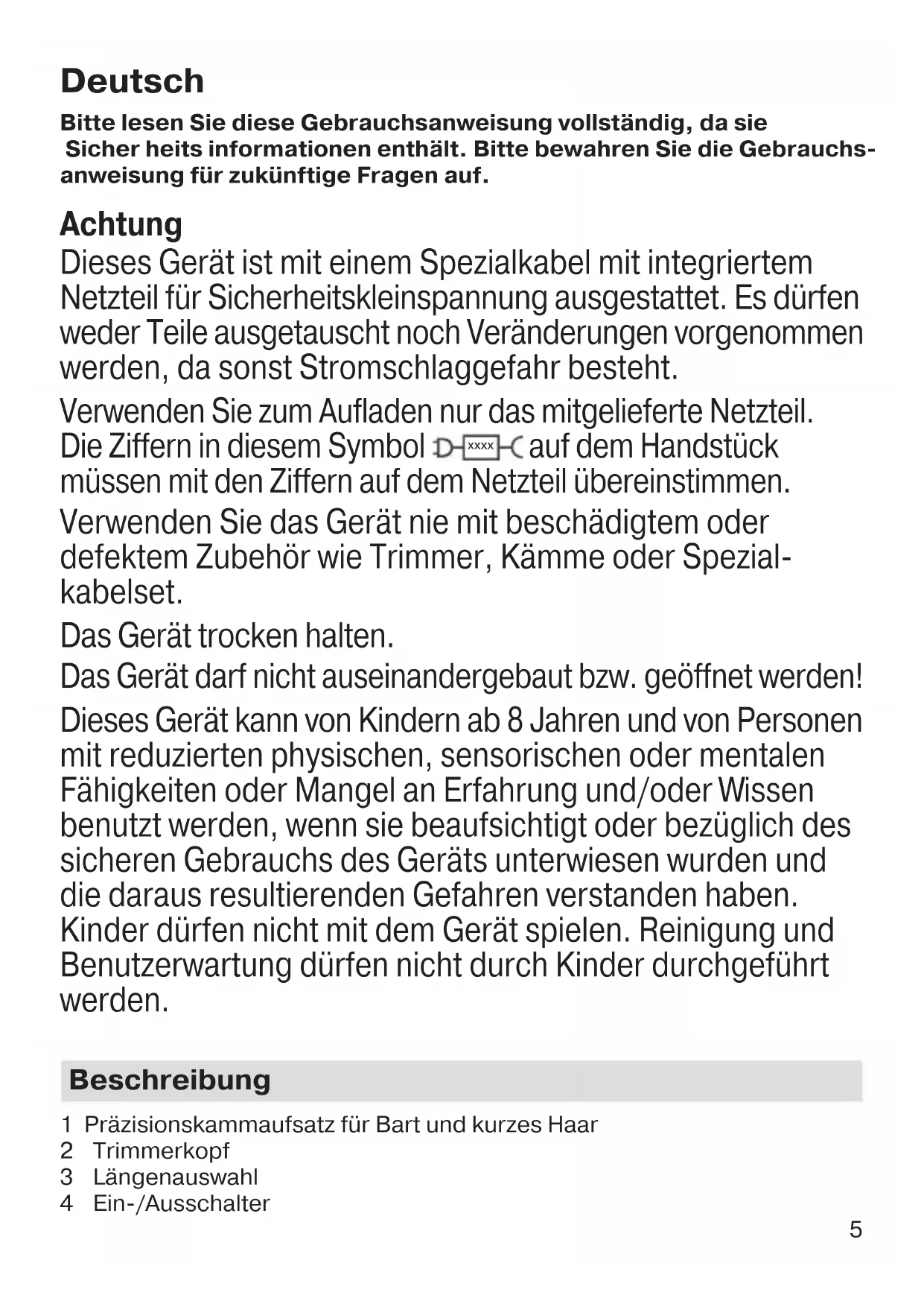 90618446_Type5516_BT_3222_3221_3220_MN_ANZ.indd 490618446_Type5516_BT_3222_3221_3220_MN_ANZ.indd 4 17.06.19 13:4217.06.19 13:42 Business Use - P&G AUTHORIZED POA-00141023 Rev 001 Effective Date 2019-06-24 Printed 2022-01-12 Page 4 of 445 Deutsch Bitte lesen Sie diese Gebrauchsanweisung vollständig, da sie Sicher heits informationen enthält. Bitte bewahren Sie die Gebrauchs- anweisung für zukünftige Fragen auf. Achtung Dieses Gerät ist mit einem Spezialkabel mit integriertem Netzteil für Sicherheitskleinspannung ausgestattet. Es dürfen weder Teile ausgetauscht noch Veränderungen vorgenommen werden, da sonst Stromschlaggefahr besteht. Verwenden Sie zum Aufladen nur das mitgelieferte Netzteil. Die Ziffern in diesem Symbol xxxx auf dem Handstück müssen mit den Ziffern auf dem Netzteil übereinstimmen. Verwenden Sie das Gerät nie mit beschädigtem oder defektem Zubehör wie Trimmer, Kämme oder Spezial- kabelset. Das Gerät trocken halten. Das Gerät darf nicht auseinandergebaut bzw. geöffnet werden! Dieses Gerät kann von Kindern ab 8 Jahren und von Personen mit reduzierten physischen, sensorischen oder mentalen Fähigkeiten oder Mangel an Erfahrung und/oder Wissen benutzt werden, wenn sie beaufsichtigt oder bezüglich des sicheren Gebrauchs des Geräts unterwiesen wurden und die daraus resultierenden Gefahren verstanden haben. Kinder dürfen nicht mit dem Gerät spielen. Reinigung und Benutzerwartung dürfen nicht durch Kinder durchgeführt werden. Beschreibung 1 Präzisionskammaufsatz für Bart und kurzes Haar 2 Trimmerkopf 3 Längenauswahl 4 Ein-/Ausschalter 90618446_Type5516_BT_3222_3221_3220_MN_ANZ.indd 590618446_Type5516_BT_3222_3221_3220_MN_ANZ.indd 5 17.06.19 13:4217.06.19 13:42 Business Use - P&G AUTHORIZED POA-00141023 Rev 001 Effective Date 2019-06-24 Printed 2022-01-12 Page 5 of 446 5 Steckerbuchse 6 Spezialkabelset 7 Ladeanzeige Elektrische Angaben siehe Bedruckung auf dem Spezialkabelset. Aufladen Die empfohlene Umgebungstemperatur zum Laden ist 5 °C bis 35 °C. Bei extrem niedrigen oder hohen Temperaturen kann es sein, dass der Akku nicht richtig oder gar nicht geladen werden kann. Die empfohlene Umge- bungstemperatur zum Trimmen liegt bei 15 °C bis 35 °C. Das Gerät nicht längere Zeit höheren Temperaturen als 50 °C aussetzen.