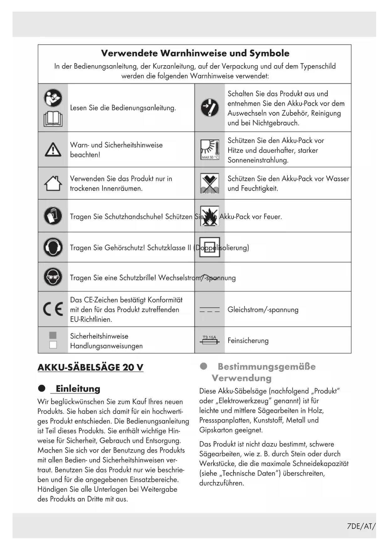 Verwendete Warnhinweise und Symbole...................... . . Seite 7 Einleitung ........................................................... . . Seite 7 Bestimmungsgemäße Verwendung ........................................ . . Seite 7 Lieferumfang.......................................................... . . Seite 8 Sie benötigen (für die Verwendung mit der App Lidl Home)..................... . . Seite 8 Teilebeschreibung ..................................................... . . Seite 8 Technische Daten ...................................................... . . Seite 8 Markenhinweise....................................................... . . Seite 10 Sicherheitshinweise ............................................... . . Seite 10 Allgemeine Sicherheitshinweise für Elektrowerkzeuge.......................... . . Seite 10 Sicherheitshinweise für Säbelsägen ........................................ . . Seite 13 Vibrations- und Geräuschminderung ....................................... . . Seite 14 Verhalten im Notfall .................................................... . . Seite 15 Restrisiken............................................................ . . Seite 15 Sicherheitshinweise für Ladegeräte ........................................ . . Seite 15 Vor dem ersten Gebrauch ........................................ . . Seite 16 Zubehör ............................................................. . . Seite 16 Bedienung .......................................................... . . Seite 16 Akku-Pack entnehmen/einsetzen .......................................... . . Seite 16 Akku-Pack-Ladezustand prüfen............................................ . . Seite 17 Akku-Pack laden....................................................... . . Seite 17 Fußplatte einstellen..................................................... . . Seite 17 Sägeblatt einsetzen/entfernen............................................ . . Seite 18 Ein- und Ausschalten.................................................... . . Seite 18 Geschwindigkeitsregelung ............................................... . . Seite 19 LED-Arbeitsleuchte ..................................................... . . Seite 19 Probelauf ............................................................ . . Seite 19 Arbeitshinweise.................................................... . . Seite 19 Produkt mit der App Lidl Home verbinden ..................... . . Seite 20 Bluetooth-Funktion des Akkus ein-/ausschalten ............................... . . Seite 20 Produkt mit der App Lidl Home verbinden ................................... . . Seite 20 Funktionen der App Lidl Home................................... . . Seite 21 Smart-Akku-Pack....................................................... . . Seite 21 Akku-Säbelsäge ....................................................... . . Seite 22 Verbindung mit der Akku-Säbelsäge wiederherstellen.......................... . . Seite 23 Auf Werkseinstellungen zurücksetzen ...................................... . . Seite 23 Datenschutzbestimmungen............................................... . . Seite 24 Produkt entkoppeln und Daten aus der App löschen........................... . . Seite 24 Probleme mit der App ‒ FAQ............................................. . . Seite 246 DE/AT/CH Reinigung und Pflege ............................................. . . Seite 24 Reinigung ............................................................ . . Seite 24 Wartung............................................................. . . Seite 24 Reparatur ............................................................ . . Seite 24 Lagerung ............................................................ . . Seite 24 Transport ............................................................ . . Seite 25 Entsorgung ......................................................... . . Seite 25 Garantie ............................................................ . . Seite 26 Abwicklung im Garantiefall .............................................. . . Seite 26 Service .............................................................. . . Seite 27 EU-Konformitätserklärung ....................................... . . Seite 287DE/AT/CH Verwendete Warnhinweise und Symbole In der Bedienungsanleitung, der Kurzanleitung, auf der Verpackung und auf dem Typenschild werden die folgenden Warnhinweise verwendet: Lesen Sie die Bedienungsanleitung. Schalten Sie das Produkt aus und entnehmen Sie den Akku-Pack vor dem Auswechseln von Zubehör, Reinigung und bei Nichtgebrauch. Warn- und Sicherheitshinweise beachten! Schützen Sie den Akku-Pack vor Hitze und dauerhafter, starker Sonneneinstrahlung. Verwenden Sie das Produkt nur in trockenen Innenräumen. Schützen Sie den Akku-Pack vor Wasser und Feuchtigkeit. Tragen Sie Schutzhandschuhe! Schützen Sie den Akku-Pack vor Feuer. Tragen Sie Gehörschutz! Schutzklasse II (Doppelisolierung) Tragen Sie eine Schutzbrille! Wechselstrom/-spannung Das CE-Zeichen bestätigt Konformität mit den für das Produkt zutreffenden EU-Richtlinien. Gleichstrom/-spannung Sicherheitshinweise Handlungsanweisungen T3.15A Feinsicherung