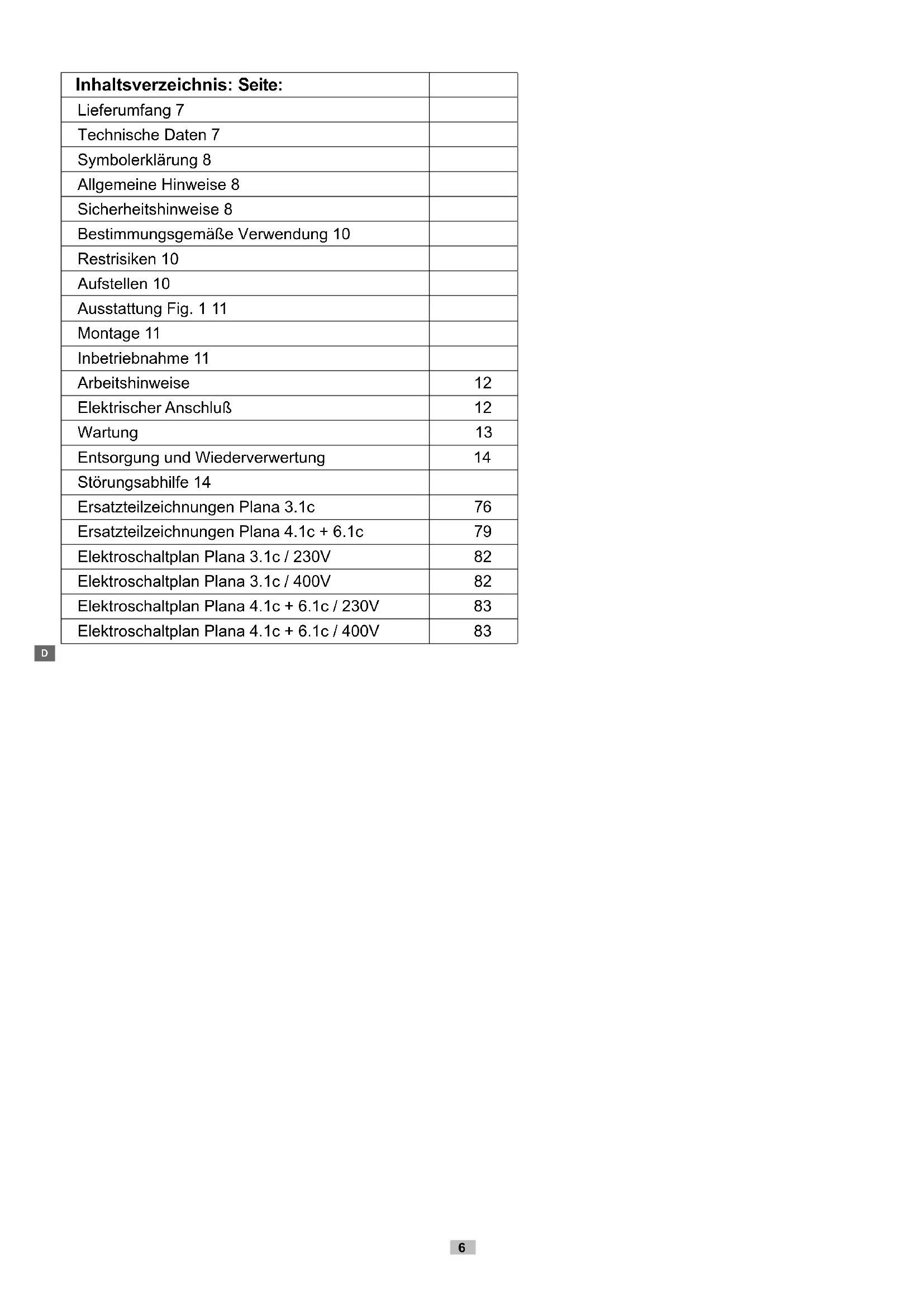 5Inhaltsverzeichnis: Seite: Lieferumfang 7 Technische Daten 7 Symbolerklärung 8 Allgemeine Hinweise 8 Sicherheitshinweise 8 Bestimmungsgemäße Verwendung 10 Restrisiken 10 Aufstellen 10 Ausstattung Fig. 1 11 Montage 11 Inbetriebnahme 11 Arbeitshinweise 12 Elektrischer Anschluß 12 Wartung 13 Entsorgung und Wiederverwertung 14 Störungsabhilfe 14 Ersatzteilzeichnungen Plana 3.1c 76 Ersatzteilzeichnungen Plana 4.1c + 6.1c 79 Elektroschaltplan Plana 3.1c / 230V 82 Elektroschaltplan Plana 3.1c / 400V 82 Elektroschaltplan Plana 4.1c + 6.1c / 230V 83 Elektroschaltplan Plana 4.1c + 6.1c / 400V 83
