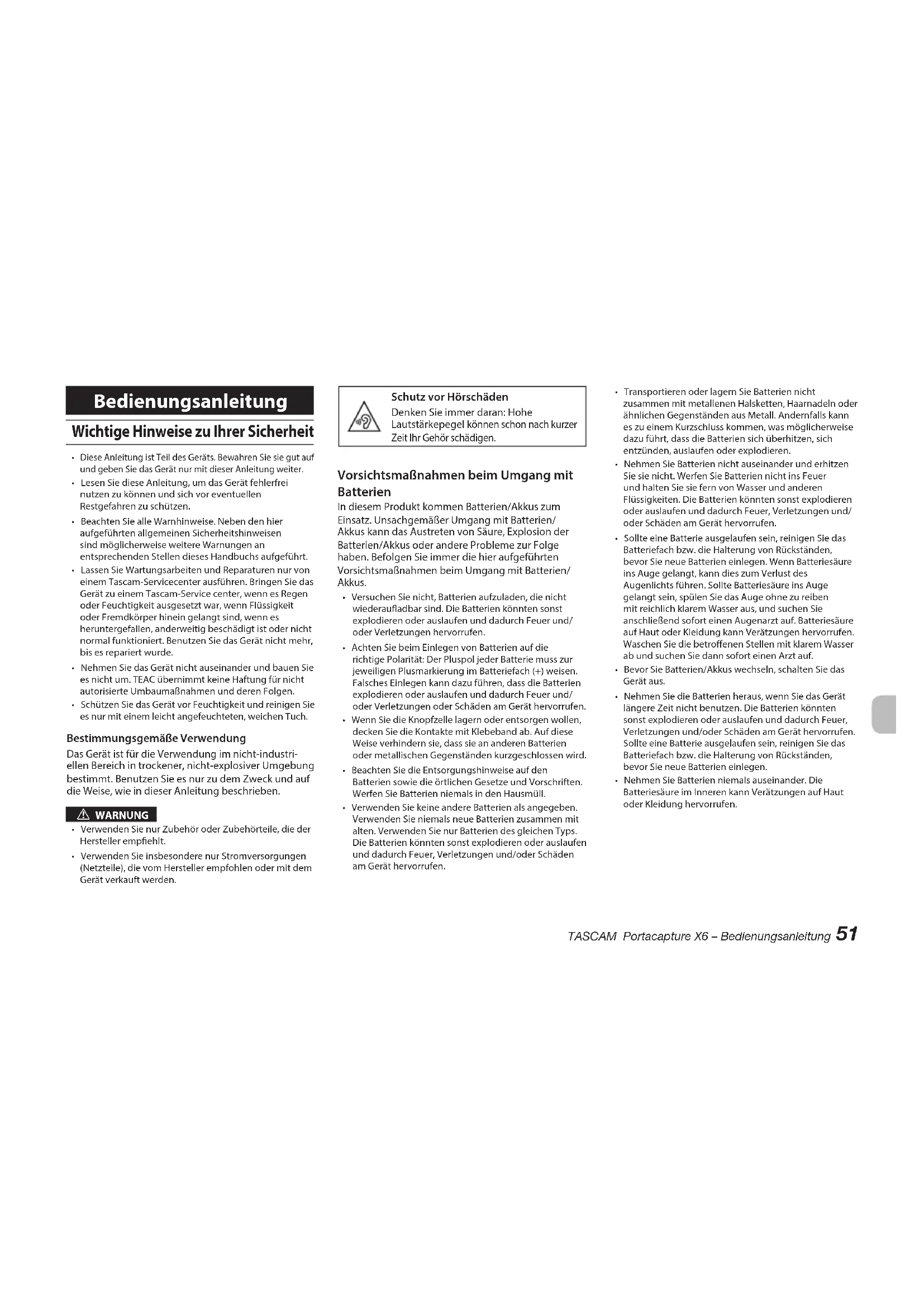 - VersuchenSienicht,Batterienaufzuladen,dienichtwiederauadbarsind.DieBatterienkönntensonstexplodierenoderauslaufenunddadurchFeuerund/oderVerletzungenhervorrufen.• AchtenSiebeimEinlegenvonBatterienaufdierichtigePolarität:DerPluspoljederBatteriemusszurjeweiligenPlusmarkierungimBatteriefach(+)weisen.FalschesEinlegenkanndazuführen,dassdieBatterienexplodierenoderauslaufenunddadurchFeuerund/oderVerletzungenoderSchädenamGeräthervorrufen.• WennSiedieKnopfzellelagernoderentsorgenwollen,deckenSiedieKontaktemitKlebebandab.AufdieseWeiseverhindernsie,dasssieananderenBatterienodermetallischenGegenständenkurzgeschlossenwird.• BeachtenSiedieEntsorgungshinweiseaufdenBatteriensowiedieörtlichenGesetzeundVorschriften.WerfenSieBatterienniemalsindenHausmüll.• VerwendenSiekeineandereBatterienalsangegeben.VerwendenSieniemalsneueBatterienzusammenmitalten.VerwendenSienurBatteriendesgleichenTyps.DieBatterienkönntensonstexplodierenoderauslaufenunddadurchFeuer,Verletzungenund/oderSchädenamGeräthervorrufen.• TransportierenoderlagernSieBatteriennichtzusammenmitmetallenenHalsketten,HaarnadelnoderähnlichenGegenständenausMetall.AndernfallskanneszueinemKurzschlusskommen,wasmöglicherweisedazuführt,dassdieBatteriensichüberhitzen,sichentzünden,auslaufenoderexplodieren.• NehmenSieBatteriennichtauseinanderunderhitzenSiesienicht.WerfenSieBatteriennichtinsFeuerundhaltenSiesiefernvonWasserundanderenFlüssigkeiten.DieBatterienkönntensonstexplodierenoderauslaufenunddadurchFeuer,Verletzungenund/oderSchädenamGeräthervorrufen.• SollteeineBatterieausgelaufensein,reinigenSiedasBatteriefachbzw.dieHalterungvonRückständen,bevorSieneueBatterieneinlegen.WennBatteriesäureinsAugegelangt,kanndieszumVerlustdesAugenlichtsführen.SollteBatteriesäureinsAugegelangtsein,spülenSiedasAugeohnezureibenmitreichlichklaremWasseraus,undsuchenSieanschließendsoforteinenAugenarztauf.BatteriesäureaufHautoderKleidungkannVerätzungenhervorrufen.WaschenSiediebetroenenStellenmitklaremWasserabundsuchenSiedannsoforteinenArztauf.• BevorSieBatterien/Akkuswechseln,schaltenSiedasGerätaus.• NehmenSiedieBatterienheraus,wennSiedasGerätlängereZeitnichtbenutzen.DieBatterienkönntensonstexplodierenoderauslaufenunddadurchFeuer,Verletzungenund/oderSchädenamGeräthervorrufen.SollteeineBatterieausgelaufensein,reinigenSiedasBatteriefachbzw.dieHalterungvonRückständen,bevorSieneueBatterieneinlegen.• NehmenSieBatterienniemalsauseinander.DieBatteriesäureimInnerenkannVerätzungenaufHautoderKleidunghervorrufen. TASCAM Portacapture X6 – Bedienungsanleitung 51Wichtige Hinweise Informationen zur elektromagnetischen Verträglichkeit DiesesGerätwurdeaufdieEinhaltungderGrenzwerte gemäßderEMV-Richtlinie2014/30/EUderEuropäi- schenGemeinschafthingeprüft.DieseGrenzwerte stelleneinenangemessenenSchutzgegenschädliche FunkstörungeninnerhalbvonWohngebäudensicher. DiesesGerätarbeitetmitHochfrequenzenergie,die ausgestrahltwerdenkann,undkannbeiunsachge- mäßer,nichtderAnleitungdesHerstellersentspre- chenderInstallationundVerwendungStörungendes Rundfunkempfangsverursachen.Esgibtjedochkeine Garantie,daßineinerbestimmtenInstallationkeine Störungenauftreten.FallsdasGerätnachweislich StörungendesRadio-oderFernsehempfangsverur- sacht,wassichdurchAus-undEinschaltendesGeräts überprüfenlässt,solltenSieeineodermehrereder folgendenMaßnahmenergreifen.