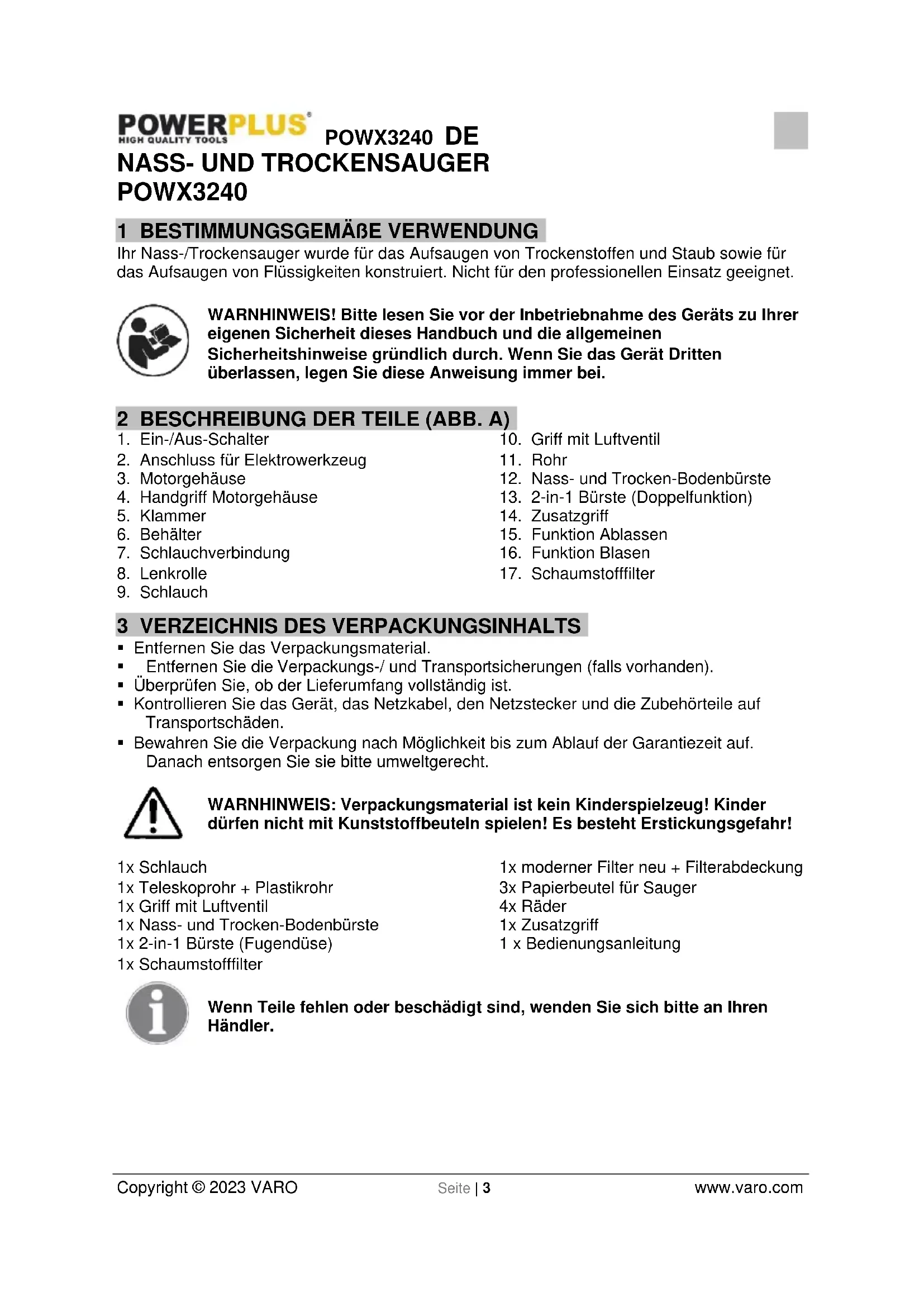 - Bewahren Sie die Verpackung nach Möglichkeit bis zum Ablauf der Garantiezeit auf. Danach entsorgen Sie sie bitte umweltgerecht. WARNHINWEIS: Verpackungsmaterial ist kein Kinderspielzeug! Kinder dürfen nicht mit Kunststoffbeuteln spielen! Es besteht Erstickungsgefahr! 1x Schlauch 1x Teleskoprohr + Plastikrohr 1x Griff mit Luftventil 1x Nass- und Trocken-Bodenbürste 1x 2-in-1 Bürste (Fugendüse) 1x Schaumstofffilter 1x moderner Filter neu + Filterabdeckung 3x Papierbeutel für Sauger 4x Räder 1x Zusatzgriff 1 x Bedienungsanleitung Wenn Teile fehlen oder beschädigt sind, wenden Sie sich bitte an Ihren Händler.POWX3240 DE Copyright © 2023 VARO Seite | 4 www.varo.com