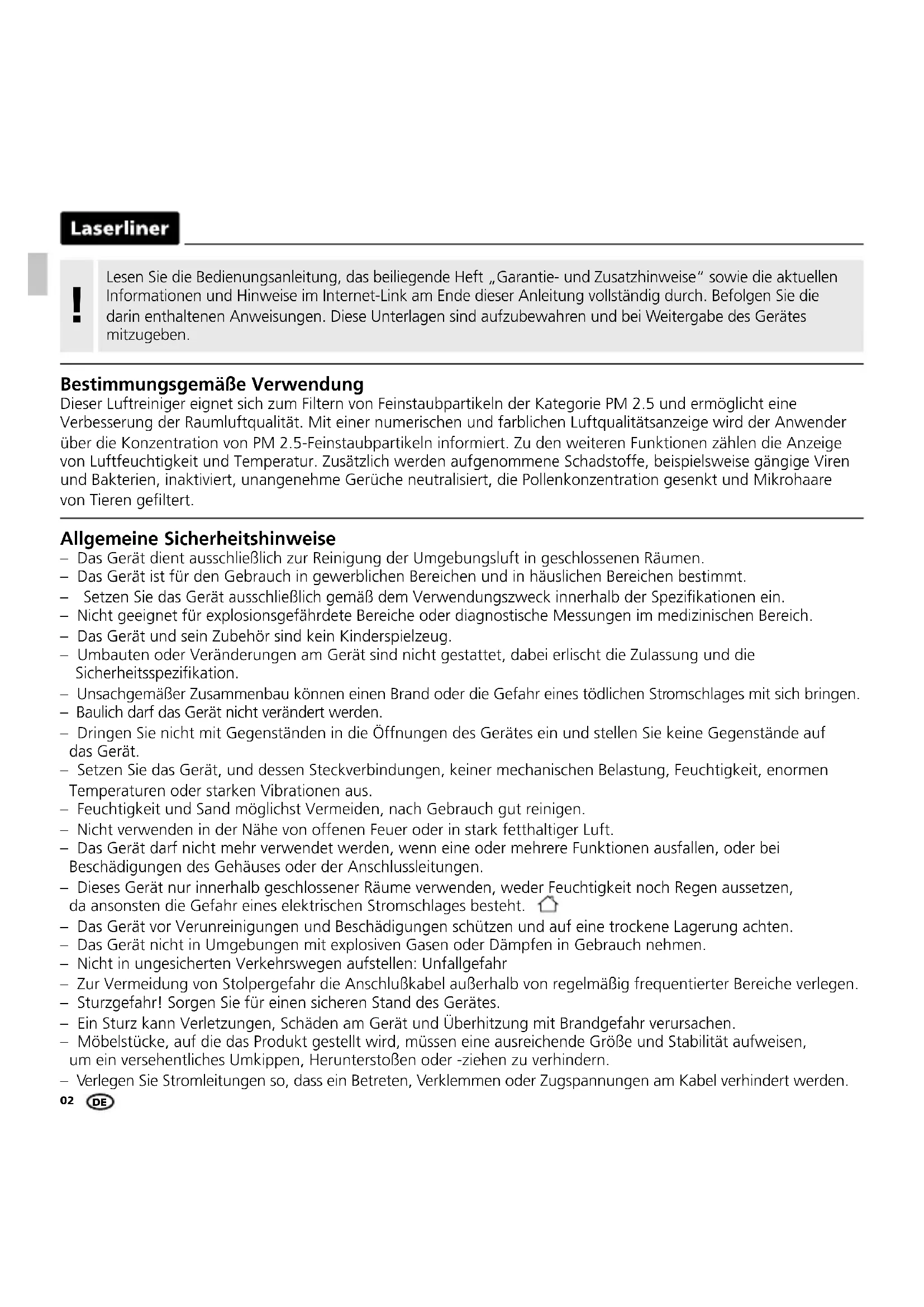 20% ... 95% rH02 DE DE Allgemeine Sicherheitshinweise – Das Gerät dient ausschließlich zur Reinigung der Umgebungsluft in geschlossenen Räumen. – Das Gerät ist für den Gebrauch in gewerblichen Bereichen und in häuslichen Bereichen bestimmt. – SetzenSiedasGerätausschließlichgemäßdemVerwendungszweckinnerhalbderSpezikationenein. – Nicht geeignet für explosionsgefährdete Bereiche oder diagnostische Messungen im medizinischen Bereich. – Das Gerät und sein Zubehör sind kein Kinderspielzeug. – Umbauten oder Veränderungen am Gerät sind nicht gestattet, dabei erlischt die Zulassung und die Sicherheitsspezikation. – Unsachgemäßer Zusammenbau können einen Brand oder die Gefahr eines tödlichen Stromschlages mit sich bringen. – Baulich darf das Gerät nicht verändert werden. – Dringen Sie nicht mit Gegenständen in die Öffnungen des Gerätes ein und stellen Sie keine Gegenstände auf das Gerät. – Setzen Sie das Gerät, und dessen Steckverbindungen, keiner mechanischen Belastung, Feuchtigkeit, enormen Temperaturen oder starken Vibrationen aus. – Feuchtigkeit und Sand möglichst Vermeiden, nach Gebrauch gut reinigen. – Nicht verwenden in der Nähe von offenen Feuer oder in stark fetthaltiger Luft. – Das Gerät darf nicht mehr verwendet werden, wenn eine oder mehrere Funktionen ausfallen, oder bei Beschädigungen des Gehäuses oder der Anschlussleitungen. – Dieses Gerät nur innerhalb geschlossener Räume verwenden, weder Feuchtigkeit noch Regen aussetzen, da ansonsten die Gefahr eines elektrischen Stromschlages besteht. – Das Gerät vor Verunreinigungen und Beschädigungen schützen und auf eine trockene Lagerung achten. – Das Gerät nicht in Umgebungen mit explosiven Gasen oder Dämpfen in Gebrauch nehmen. – Nicht in ungesicherten Verkehrswegen aufstellen: Unfallgefahr – Zur Vermeidung von Stolpergefahr die Anschlußkabel außerhalb von regelmäßig frequentierter Bereiche verlegen. – Sturzgefahr! Sorgen Sie für einen sicheren Stand des Gerätes. – Ein Sturz kann Verletzungen, Schäden am Gerät und Überhitzung mit Brandgefahr verursachen. – Möbelstücke, auf die das Produkt gestellt wird, müssen eine ausreichende Größe und Stabilität aufweisen, um ein versehentliches Umkippen, Herunterstoßen oder -ziehen zu verhindern. – Verlegen Sie Stromleitungen so, dass ein Betreten, Verklemmen oder Zugspannungen am Kabel verhindert werden. Bestimmungsgemäße Verwendung Dieser Luftreiniger eignet sich zum Filtern von Feinstaubpartikeln der Kategorie PM 2.5 und ermöglicht eine Verbesserung der Raumluftqualität. Mit einer numerischen und farblichen Luftqualitätsanzeige wird der Anwender über die Konzentration von PM 2.5-Feinstaubpartikeln informiert. Zu den weiteren Funktionen zählen die Anzeige von Luftfeuchtigkeit und Temperatur. Zusätzlich werden aufgenommene Schadstoffe, beispielsweise gängige Viren und Bakterien, inaktiviert, unangenehme Gerüche neutralisiert, die Pollenkonzentration gesenkt und Mikrohaare vonTierengeltert. Lesen Sie die Bedienungsanleitung, das beiliegende Heft „Garantie- und Zusatzhinweise“ sowie die aktuellen Informationen und Hinweise im Internet-Link am Ende dieser Anleitung vollständig durch. Befolgen Sie die darin enthaltenen Anweisungen. Diese Unterlagen sind aufzubewahren und bei Weitergabe des Gerätes mitzugeben.
