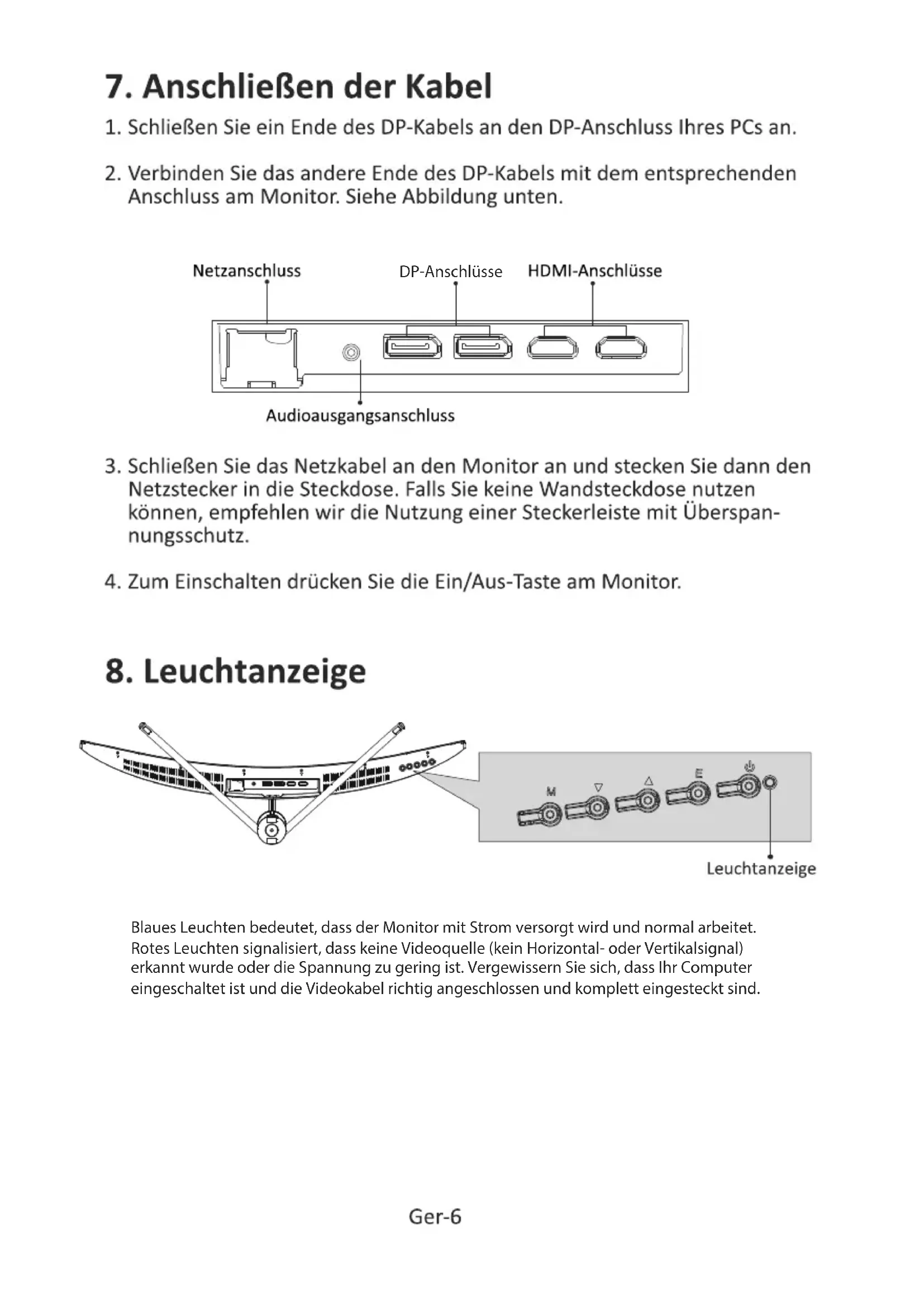 100-240 VIm Menü nach oben drückenBlaues Leuchten bedeutet, dass der Monitor mit Strom versorgt wird und normal arbeitet. Rotes Leuchten signalisiert, dass keine Videoquelle (kein Horizontal- oder Vertikalsignal) erkannt wurde oder die Spannung zu gering ist. Vergewissern Sie sich, dass Ihr Computer eingeschaltet ist und die Videokabel richtig angeschlossen und komplett eingesteckt sind. DP-AnschlüsseDas Bildschirmmenü kann zur Anpassung der Einstellungen des Monitors genutzt werden und wird nach Einschalten und Drücken der Taste angezeigt.