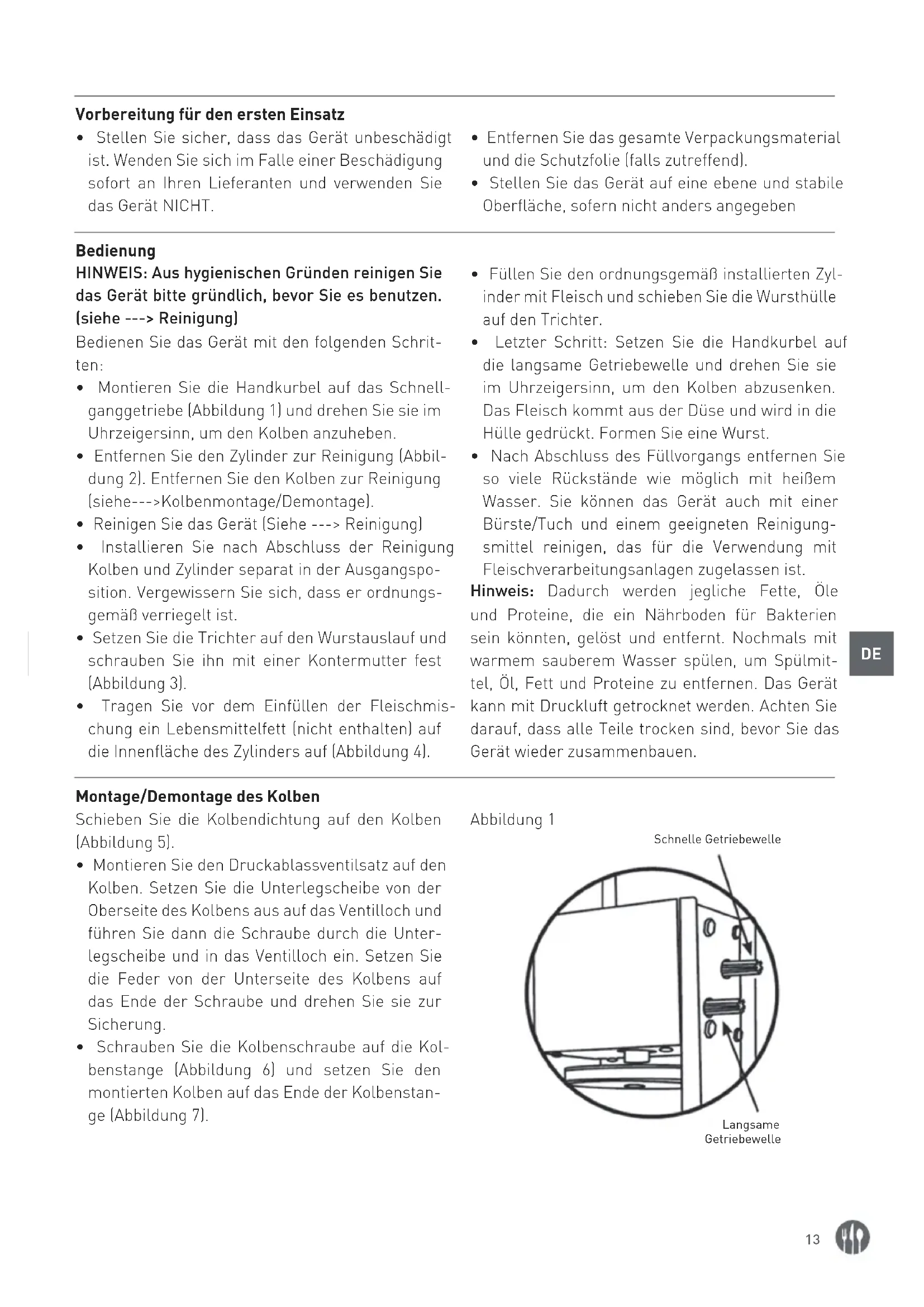 - Jede andere Verwendung des Gerätes gilt als nicht bestimmungsgemäß. Der Benutzer ist al- lein verantwortlich für die unsachgemäße Nutzu- ng des Gerätes. Beschreibung des herstellungsverfahrens Mithilfe unseres Stopf-/Füllgeräts können Sie köstliche Wurstwaren herstellen. Das Gerät ist mit einem horizontalen und vertikalen Gestell ausges- tattet und besitzt ein neuartiges Getriebesystem. Der Kolben wird zum schnellen und bedienerfre- undlichen Befüllen über eine Getriebeuntersetzung mit Zweistufengetriebe angetrieben. Das Gerät eignet sich ideal für Wursthersteller oder Restaurants, die köstliche Wurstfüllungen selber herstellen möchten.11