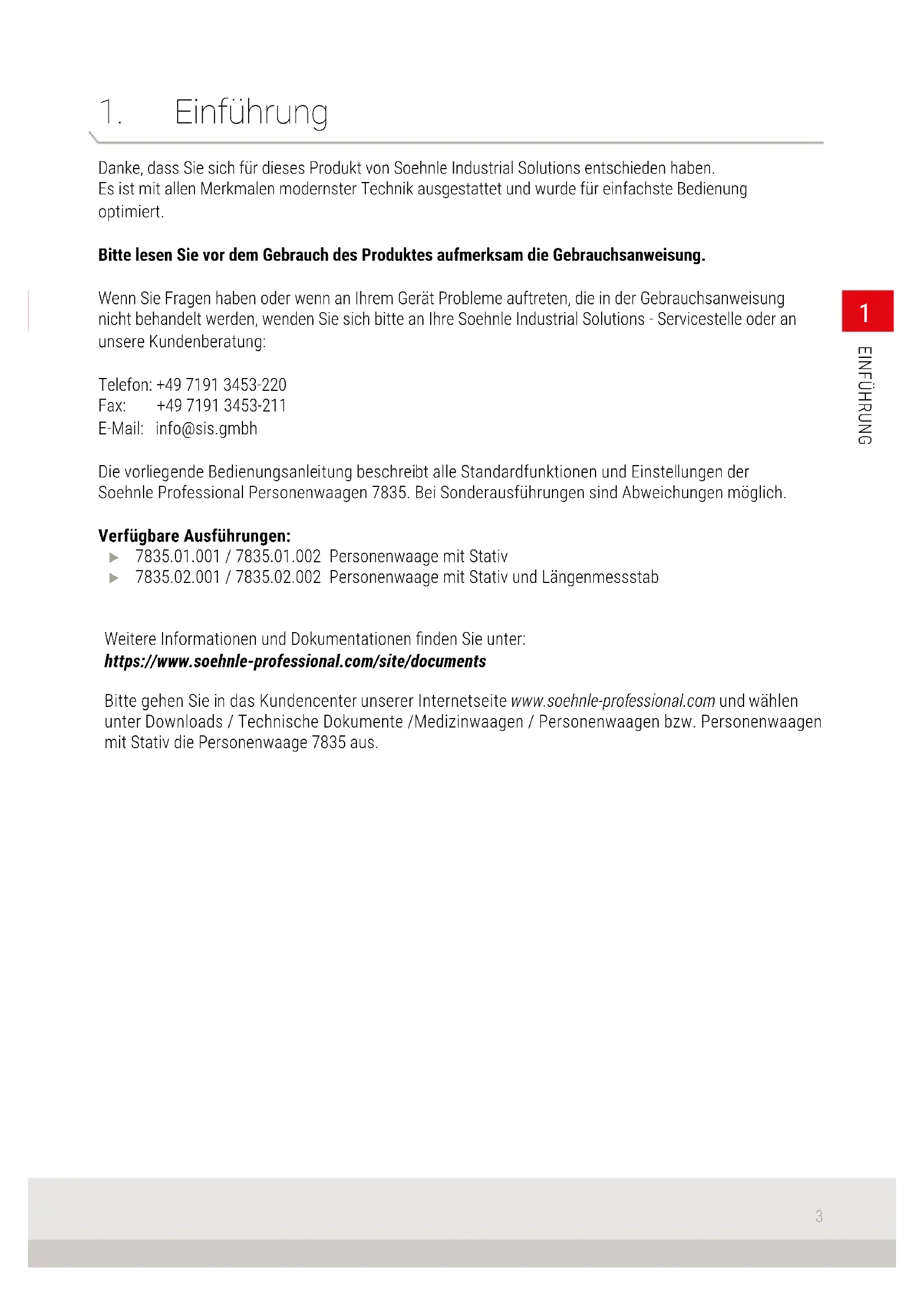 Danke, dass Sie sich für dieses Produkt von Soehnle Industrial Solutions entschieden haben. Es ist mit allen Merkmalen modernster Technik ausgestattet und wurde für einfachste Bedienung optimiert. Bitte lesen Sie vor dem Gebrauch des Produktes aufmerksam die Gebrauchsanweisung. Wenn Sie Fragen haben oder wenn an Ihrem Gerät Probleme auftreten, die in der Gebrauchsanweisung nicht behandelt werden, wenden Sie sich bitte an Ihre Soehnle Industrial Solutions - Servicestelle oder an unsere Kundenberatung: Telefon: +49 7191 3453-220 Fax: +49 7191 3453-211 E-Mail: info@sis.gmbh Die vorliegende Bedienungsanleitung beschreibt alle Standardfunktionen und Einstellungen der Soehnle Professional Personenwaagen 7835. Bei Sonderausführungen sind Abweichungen möglich. Verfügbare Ausführungen: