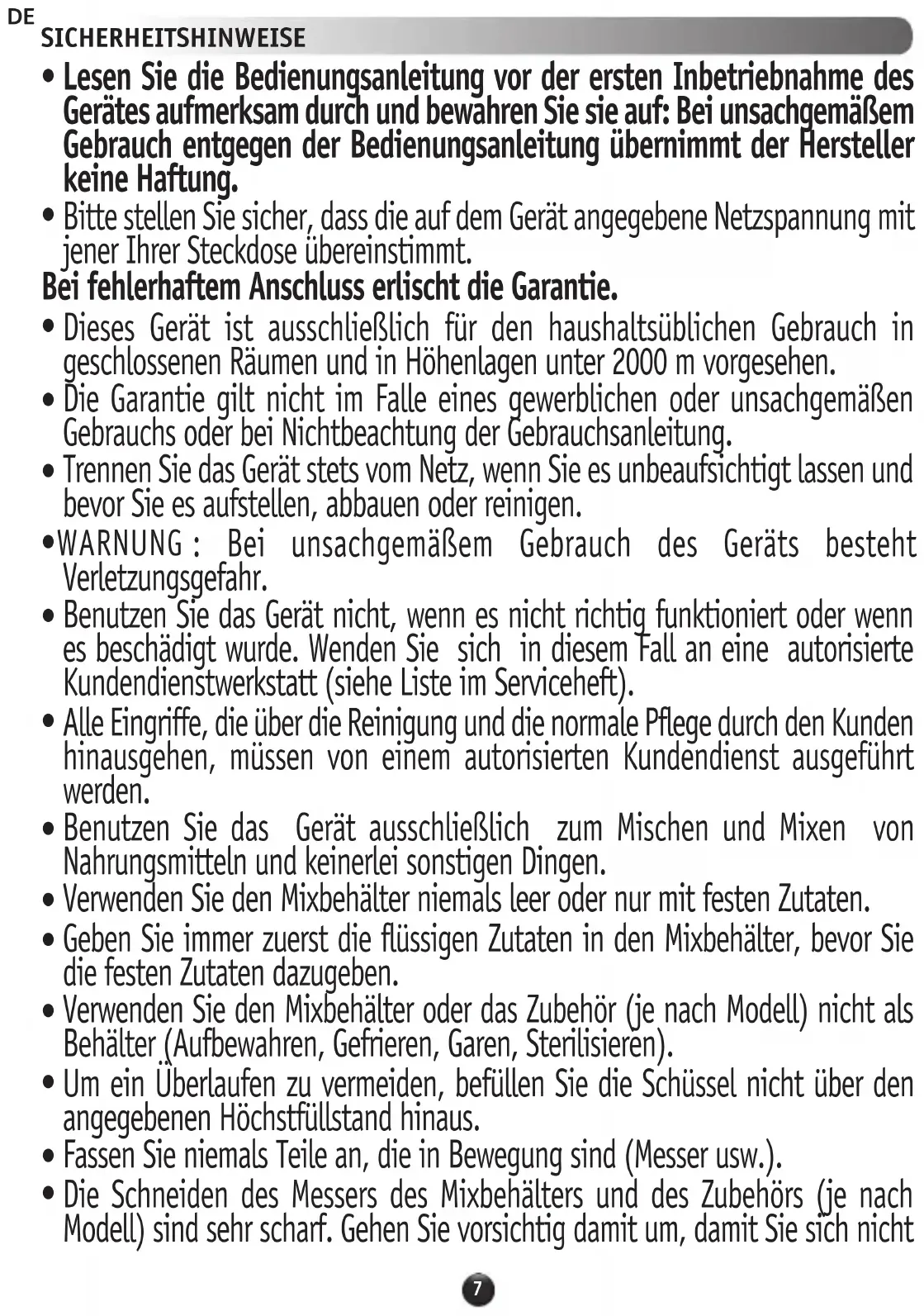 Benutzen Sie das Gerät ausschließlich zum Mischen und Mixen von Nahrungsmitteln und keinerlei sonstigen Dingen.