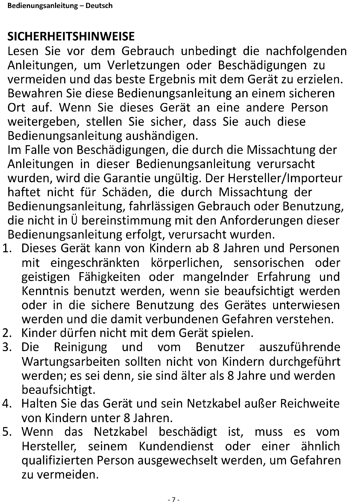 2. Kinder dürfen nicht mit dem Gerät spielen.