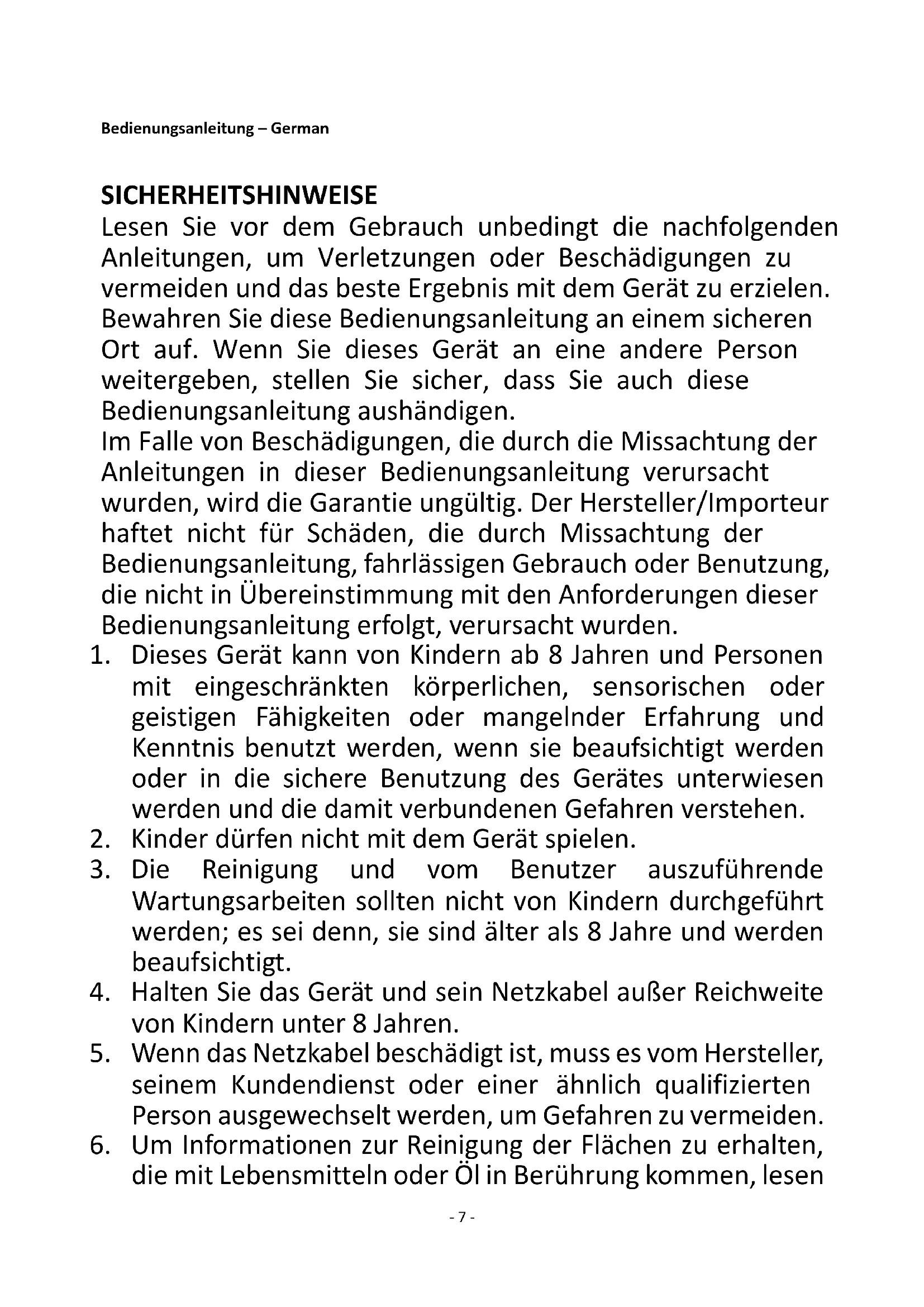 Recycling – European Directive 2012/19/EU This marking indicates that this product should not be disposed with other household wastes. To prevent possible harm to the environment or human health from uncontrolled waste disposal, recycle it responsibly to promote the sustainable reuse of material resources. To return your used device, please use the return and collection systems or contact the retailer where the product was purchased. They can take this product for environmental safe recycling. Manufactured by: Emerio B.V. Zomervaart 1A, 2033 DA Haarlem, The Netherlands- 7 - Bedienungsanleitung – German SICHERHEITSHINWEISE Lesen Sie vor dem Gebrauch unbedingt die nachfolgenden Anleitungen, um Verletzungen oder Beschädigungen zu vermeiden und das beste Ergebnis mit dem Gerät zu erzielen. Bewahren Sie diese Bedienungsanleitung an einem sicheren Ort auf. Wenn Sie dieses Gerät an eine andere Person weitergeben, stellen Sie sicher, dass Sie auch diese Bedienungsanleitung aushändigen. Im Falle von Beschädigungen, die durch die Missachtung der Anleitungen in dieser Bedienungsanleitung verursacht wurden, wird die Garantie ungültig. Der Hersteller/Importeur haftet nicht für Schäden, die durch Missachtung der Bedienungsanleitung, fahrlässigen Gebrauch oder Benutzung, die nicht in Übereinstimmung mit den Anforderungen dieser Bedienungsanleitung erfolgt, verursacht wurden.