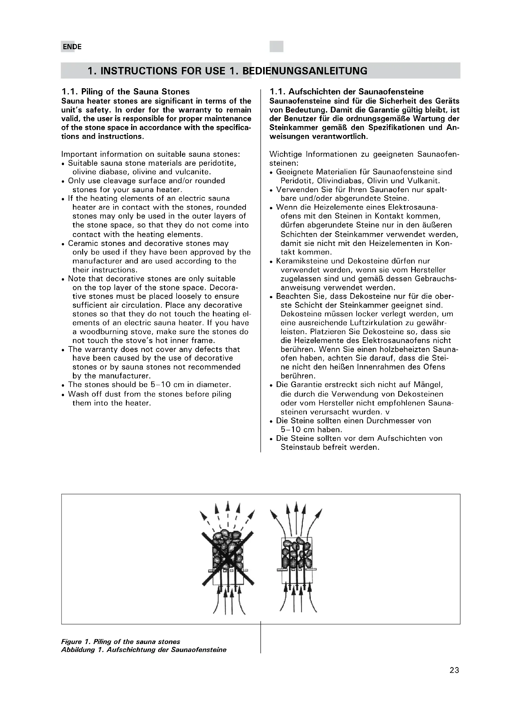 - Wash off dust from the stones before piling them into the heater. 1.1. Aufschichten der Saunaofensteine Saunaofensteine sind für die Sicherheit des Geräts von Bedeutung. Damit die Garantie gültig bleibt, ist der Benutzer für die ordnungsgemäße Wartung der Steinkammer gemäß den Spezifikationen und An- weisungen verantwortlich. Wichtige Informationen zu geeigneten Saunaofen- steinen: