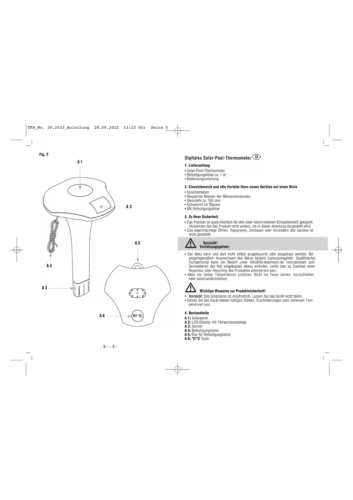 Zachowujcie instrukcję obsługi w dobrym stanie! TFA_No. 30.2033_Anleitung 28.09.2022 11:23 Uhr Seite 4– 8 – – 9 – Digitales Solar-Pool-Thermometer 1. Lieferumfang• Solar-Pool-Thermometer • Befestigungsleine ca. 1 m• Bedienungsanleitung2. Einsatzbereich und alle Vorteile Ihres neuen Gerätes auf einen Blick• Solarbetrieben• Bequemes Ablesen der Wassertemperatur• Messtiefe ca. 165 mm • Schwimmt im Wasser• Mit Befestigungsleine3. Zu Ihrer Sicherheit• Das Produkt ist ausschließlich für den oben beschriebenen Einsatzbereich geeignet.Verwenden Sie das Produkt nicht anders, als in dieser Anleitung dargestellt wird. • Das eigenmächtige Öffnen, Reparieren, Umbauen oder Verändern des Gerätes istnicht gestattet.Vorsicht! Verletzungsgefahr: