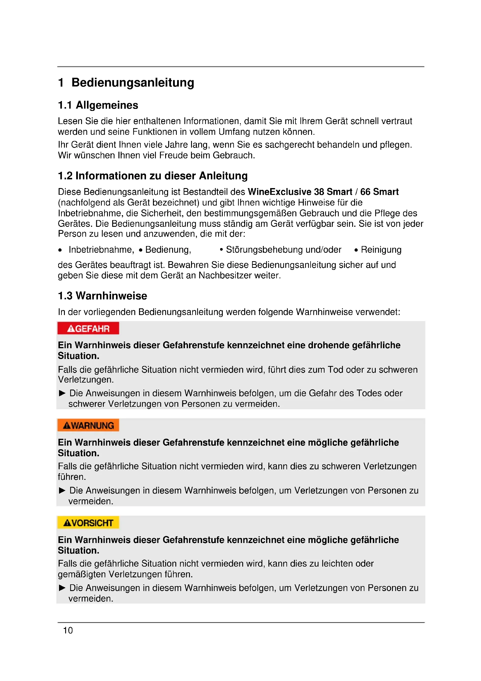 Diese Bedienungsanleitung ist Bestandteil des WineExclusive 38 Smart / 66 Smart (nachfolgend als Gerät bezeichnet) und gibt Ihnen wichtige Hinweise für die Inbetriebnahme, die Sicherheit, den bestimmungsgemäßen Gebrauch und die Pflege des Gerätes. Die Bedienungsanleitung muss ständig am Gerät verfügbar sein. Sie ist von jeder Person zu lesen und anzuwenden, die mit der: