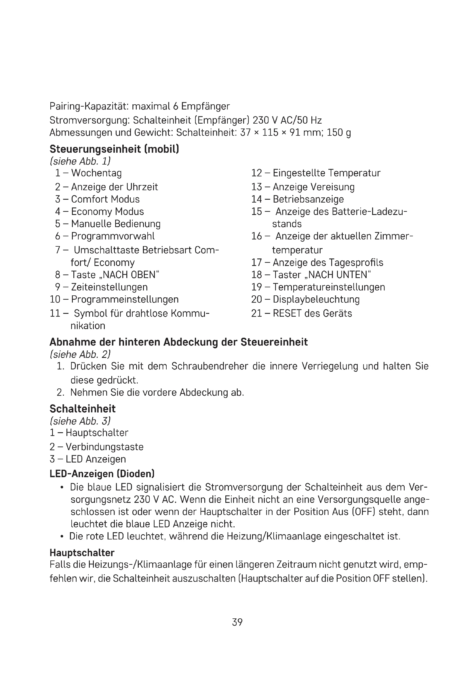 Schalteinheit (siehe Abb. 3) 1 – Hauptschalter 2 – Verbindungstaste 3 – LED Anzeigen LED-Anzeigen (Dioden)