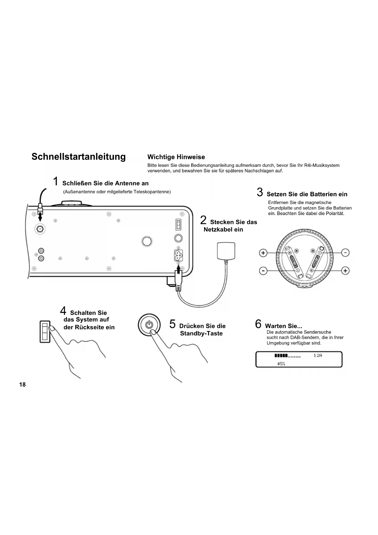 NL18 Schnellstartanleitung Wichtige Hinweise Bitte lesen Sie diese Bedienungsanleitung aufmerksam durch, bevor Sie Ihr R4i-Musiksystem verwenden, und bewahren Sie sie für späteres Nachschlagen auf. 1 Schließen Sie die Antenne an (Außenantenne oder mitgelieferte Teleskopantenne) 2 Stecken Sie das Netzkabel ein 3 Setzen Sie die Batterien ein Entfernen Sie die magnetische Grundplatte und setzen Sie die Batterien ein. Beachten Sie dabei die Polarität. 4 Schalten Sie das System auf der Rückseite ein 5 Drücken Sie die Standby-Taste 6 Warten Sie... Die automatische Sendersuche sucht nach DAB-Sendern, die in Ihrer Umgebung verfügbar sind.19 7 Anhören... Wählen Sie zuerst Ihre Wiedergabequelle aus ...Audiodaten auf USB- Speichermedium Stecken Sie das USB-Speichermedium an den USB-Anschluss. Das R4i-System sucht MP3/WMA-Musikdateien und startet die Wiedergabe automatisch. ...CD Wenn Sie eine CD in das CD-Fach einlegen, wird automatisch die CD-Quelle ausgewählt. Nach dem Einlegen beginnt automatisch die Wiedergabe der CD. ...Radio DAB: Drücken Sie ▲▼, um die verfügbaren Sender auszuwählen. Mit OK rufen Sie den Sender auf. FM: Halten Sie ▲▼ gedrückt, um nach dem nächsten verfügbaren Sender zu suchen. ...Musikdaten auf einem iPod Entfernen Sie die Staubabdeckung, und setzen Sie den korrekten Universaladapter für iPod (wenn vorhanden) ein. Dieser sorgt für eine korrekte Ausrichtung und vermeidet die Abnutzung des Anschlusses. Wenn Sie für Ihr Modell keinen Adapter für die Dockingstation besitzen, können Sie ihn direkt von Apple oder von einem Apple-Händler erwerben. Die verschiedenen iPod-Modelle können zwar mit dem R4i auch ohne einen Adapter verwendet werden, jedoch müssen Sie dann beim Einstecken und Herausziehen besonders Acht geben. DE20 Audio Drücken Sie AUDIO, um durch die Einstellungen zu navigieren. (3D Sound, Loudness [=Lautstärke], EQ [=Equalizer]). Optionen, die Sie ändern können, blinken. Verwenden Sie zum Ändern der Einstellung die Tasten ▲▼.Drücken Sie OK, um die Einstellung zu bestätigen. Clock (Uhr) Drücken Sie CLOCK, um Alarm, Sleep (Schlafmodus) oder Manual Clock Set (manuelles Einstellen der Uhr) auszuwählen. Einstellen des Alarms Wählen Sie „Alarm“ und drücken Sie OK. ON/OFF blinkt dann. Verwenden Sie die Tasten ▲▼ und OK, um die Alarmzeit, Wiedergabequelle und Lautstärke festzulegen. Nachdem Sie die Einstellungen vorgenommen haben, schaltet sich das Display nach 5 Sekunden ab. auf dem Display weist darauf hin, dass der Alarm festgelegt wurde. Einstellen des Schlafmodus Wählen Sie „Sleep“ und drücken Sie OK. ON/OFF blinkt. Stellen Sie mithilfe der Tasten ▲▼ und OK den Timer ein. Nachdem Sie die Einstellungen vorgenommen haben, schaltet sich das Display nach 5 Sekunden ab. Ein „S“ weist darauf hin, dass der Schlafmodus aktiviert ist. Manuelles Einstellen der Uhr Verwenden Sie diese Funktion zum Einstellen der Uhr, wenn Sie sich an einem Ort benden, an dem das R4i- System das Zeitsignal nicht automatisch von DAB- oder FM-Sendern empfangen kann, die das Signal über den RDS-Dienst senden. Anzeigen der Alarmeinstellungen Drücken Sie kurz CLOCK. Alarm ein- bzw. ausschalten Drücken Sie kurz CLOCK. Halten Sie die folgende Taste gedrückt: OK Standby – Drücken Sie diese Taste, um das System ein- bzw. auszuschalten Lautstärke – Drehen Sie den Regler nach links oder rechts. Snooze (Pausentaste) – Drücken Sie diese Taste, wenn der Alarm ertönt, um den Timer auf 5 Minuten einzustellen. Alarm abstellen – Halten Sie die Taste gedrückt Info Drücken Sie INFO , um die verschiedenen Informationen auf dem Display anzuzeigen. DAB-Modus ● Programmdetails/Interpret/Titelname ● Signalstärke ● Band und Frequenz ● Programmtyp – z. B. Klassik, Pop ● Übertragungstyp und Datenrate ● Multiplex-Name ● Zeit und Datum FM-Modus ● RadioText – Programmdetails ● Signalstärke ● Musiktyp – z. B. Klassik, Pop ● Audio-Modus – Auto (Stereo)/Mono ● Sendername ● Zeit und Datum Source (Wiedergabequelle) Drücken Sie SOURCE (die aktuelle Wiedergabequelle blinkt) und wählen Sie dann mithilfe der Tasten ▲▼ DAB, FM, CD, USB, AUX oder iPod aus. Drücken Sie OK, um die gewünschte Einstellung auszuwählen. Fernbedienung Radiosender Über diese Tasten können Sie 5 DAB- und 5 FM-Sender speichern. Zur Auswahl eines Senders drücken Sie 1-5. Zum Speichern eines Senders halten Sie 1-5 gedrückt.21 DOWN (Nach unten) iPod - Menü-Navigation CD/USB (MP3) - Album nach unten SHUFFLE (Zufallswiedergabe) iPod - Wiedergabe der Titel in zufälliger ReihenfolgeCD/USB - 1 wiederholen/Alles wiederholen/Zufallswiedergabe Steuerungen für iPod, CD und USB-Speichermedien ENTER (Auswahl/Eingabe) Menü-Navigation iPod UP (Nach oben) iPod - Menü-Navigation CD/USB (MP3) - Album nach oben INFO Album-/TitelinformationenCD/USB im MP3-Modus Wiedergabe/Pause (Taste einmal drücken) Stopp (Taste gedrückt halten) MENU iPod menu navigation MENU Menü-Navigation iPod iPod/CD/ USB Vorheriger Titel (Taste einmal drücken) Schneller Rücklauf (Taste gedrückt halten) iPod/CD/ USB Nächster Titel (Taste einmal drücken) Schneller Vorlauf (Taste gedrückt halten) DE22 Wiedergabe des USB- Speichermediums 3,5-mm-Kopfhörerbuchse Aux-Eingang Zum Anschluss einer externen Wiedergabequelle (z. B. MP3-Player). CD ausgeben Fernbedienungsanschluss Übersicht über das R4i-System Ausgänge (R) (L) Zum Anschluss an externen Verstärker oder an ein Aufnahmesystem. Eingänge (R) (L) Zum Anschluss einer externen Wiedergabequelle (z. B. MP3-Player). Lautstärkeregelung Empfohlene Einstellung: 12-Uhr- Stellung Antennenanschluss Netzschalter T2.0A-Sicherung 230 V 50 Hz 0,75 A Netzanschluss T2.0A POWER 230V 50Hz 0.75A