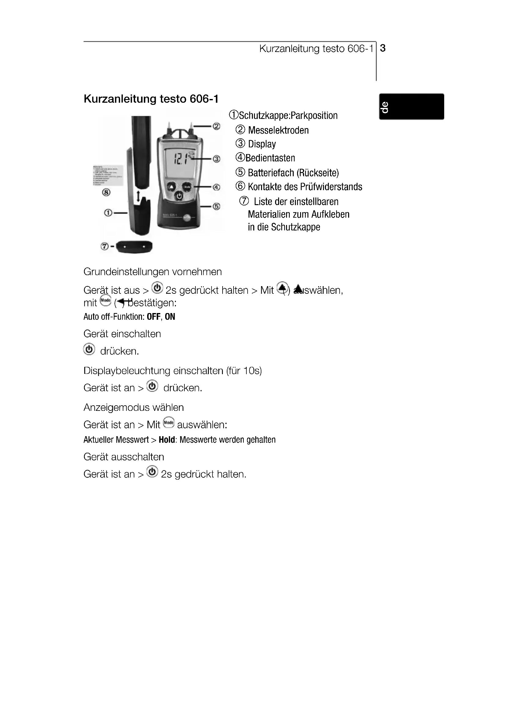Kurzanleitung testo 606-1 À Schutzkappe: Parkposition Á Messelektroden  Display à Bedientasten Ä Batteriefach (Rückseite) Å Kontakte des Prüfwiderstands ÆListe der einstellbaren Materialien zum Aufkleben in die Schutzkappe Grundeinstellungen vornehmen Gerät ist aus > 2s gedrückt halten > Mit ( ) auswählen, mit ( ) bestätigen: Auto off-Funktion: OFF, ON Gerät einschalten drücken. Displaybeleuchtung einschalten (für 10s) Gerät ist an > drücken. Anzeigemodus wählen Gerät ist an > Mit auswählen: Aktueller Messwert > Hold: Messwerte werden gehalten Gerät ausschalten Gerät ist an > 2s gedrückt halten.