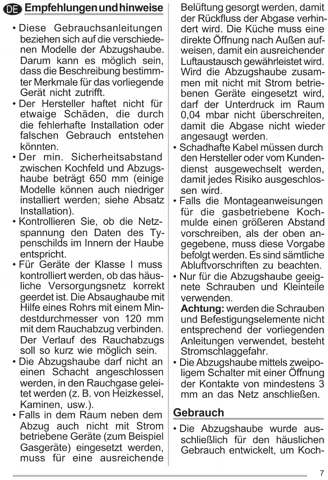 - Die Abzugshaube mittels zweipo- ligem Schalter mit einer Öffnung der Kontakte von mindestens 3 mm an das Netz anschließen. Gebrauch