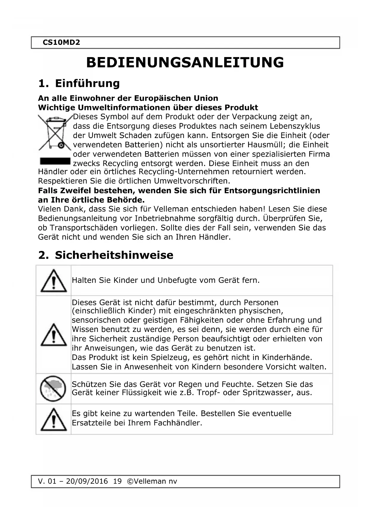Finden Sie kostenlos die Bedienungsanleitung des Geräts CS10MD2 VELLEMAN als PDF.