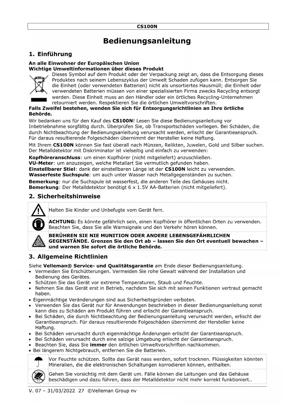 Abmessungen Länge 60~91cm Suchspule Ø16.5cm Gewicht ±660g Verwenden Sie dieses Gerät nur mit originellen Zubehörteilen. Velleman Group nv übernimmt keine Haftung für Schaden oder Verletzungen bei (falscher) Anwendung dieses Gerätes. Für mehr Informationen zu diesem Produkt und die neueste Version dieser Bedienungsanleitung, siehe www.velleman.eu. Alle Änderungen ohne vorherige Ankündigung vorbehalten. RED Konformitätserklärung Hiermit erklärt Velleman Group nv, dass der Funkanlagentyp [CS100N] der Richtlinie 2014/53/EU entspricht. Der vollständige Text der EU-Konformitätserklärung ist unter der folgenden Internetadresse verfügbar: www.velleman.eu. © URHEBERRECHT Velleman Group nv besitzt das Urheberrecht für diese Bedienungsanleitung. Alle weltweiten Rechte vorbehalten. Ohne vorherige schriftliche Genehmigung des Urhebers ist es nicht gestattet, diese Bedienungsanleitung ganz oder in Teilen zu reproduzieren, zu kopieren, zu übersetzen, zu bearbeiten oder zu speichern.CS100N