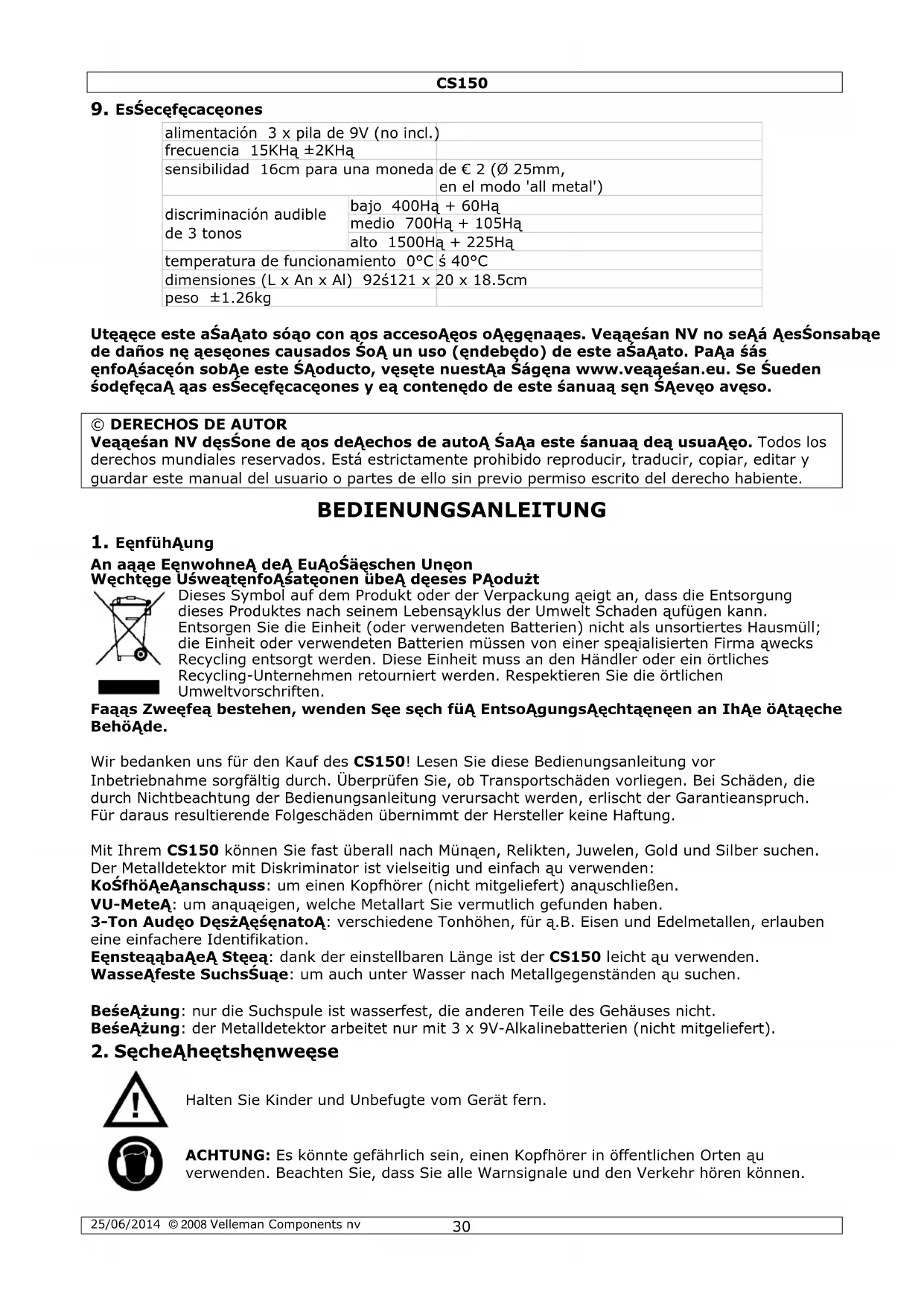 - Die mitgelieferte Suchspule ist wasserdicht und kann in Salz- und Süßwasser untergetaucht werden. Schützen Sie die Bedienungskonsole aber vor Wasser! Spülen Sie die Suchspule nach Gebrauch in Salzwasser mit klarem Wasser. So vermeiden Sie Korrosion der Metallteile.CS150 25/06/2014 © 2008 Velleman Components nv