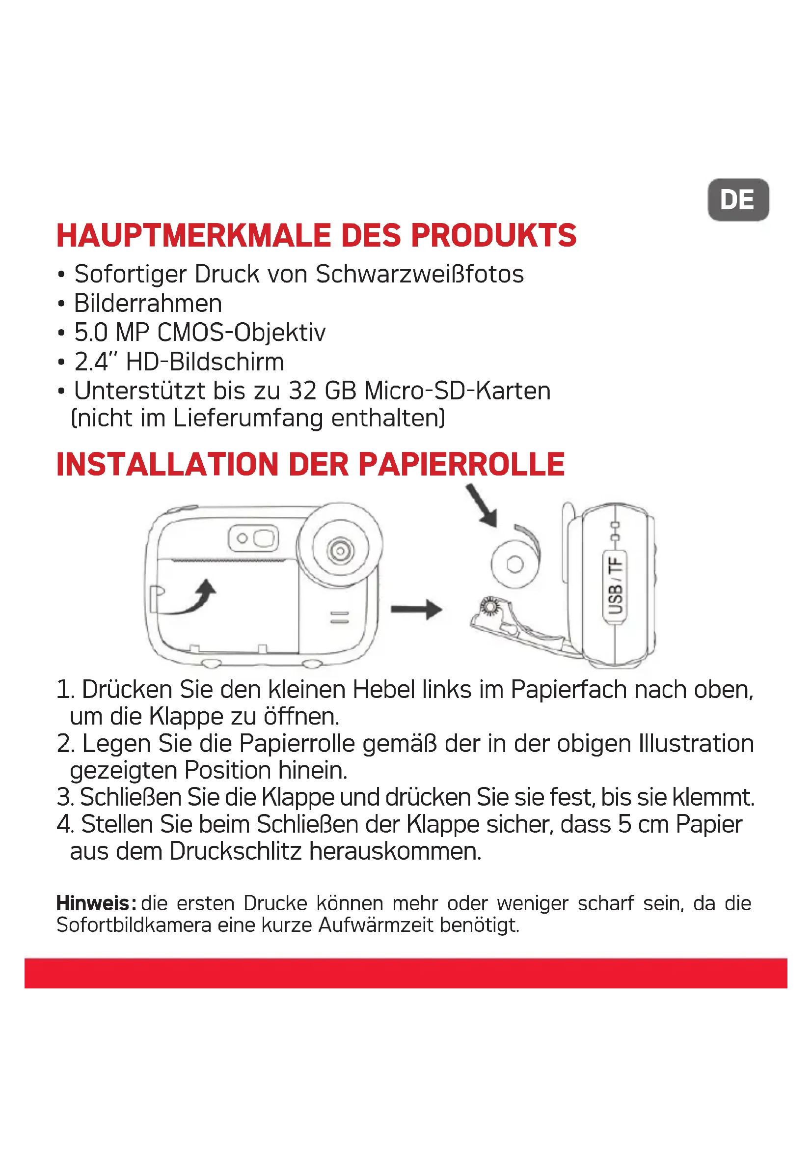 aus dem Druckschlitz herauskommen. Hinweis : die ersten Drucke können mehr oder weniger scharf sein, da die Sofortbildkamera eine kurze Aufwärmzeit benötigt.DE