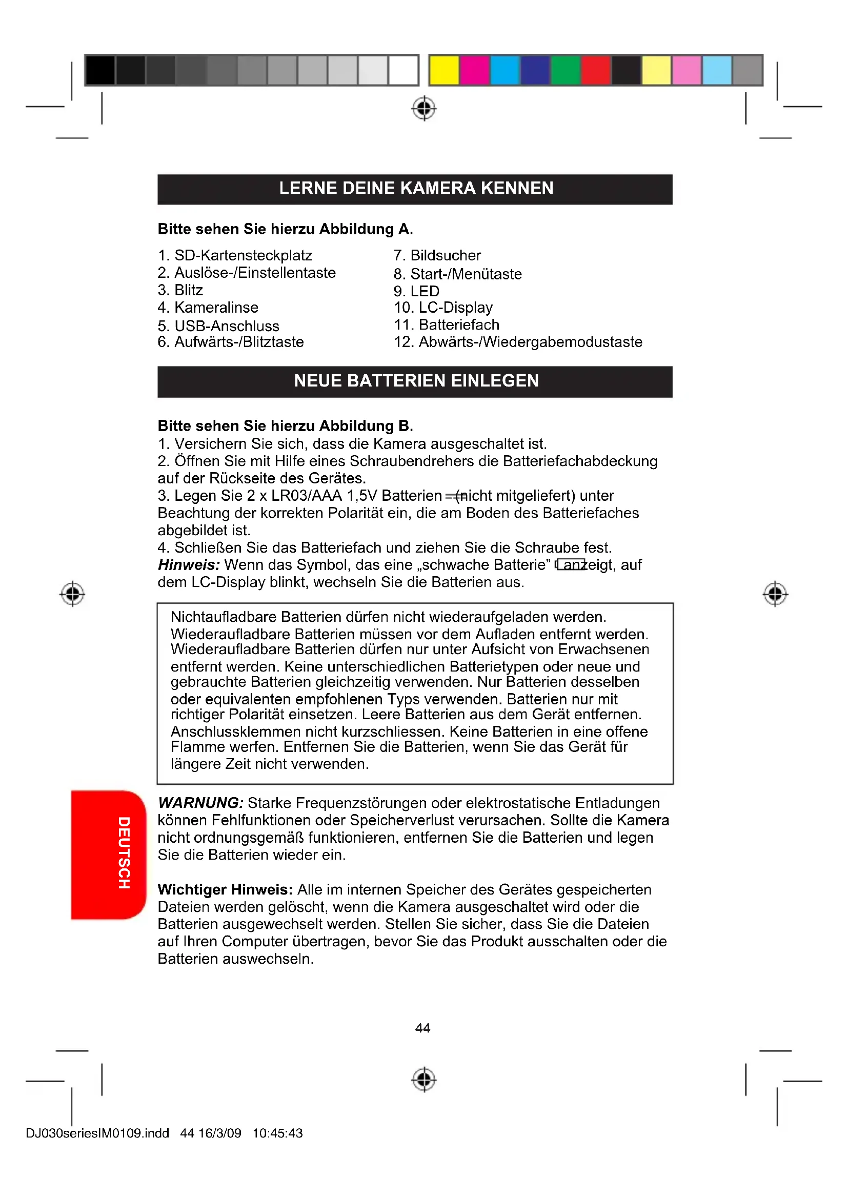 Hinweis: Wenn das Symbol, das eine „schwache Batterie” anzeigt, auf dem LC-Display blinkt, wechseln Sie die Batterien aus. Nichtauadbare Batterien dürfen nicht wiederaufgeladen werden. Wiederauadbare Batterien müssen vor dem Auaden entfernt werden. Wiederauadbare Batterien dürfen nur unter Aufsicht von Erwachsenen entfernt werden. Keine unterschiedlichen Batterietypen oder neue und gebrauchte Batterien gleichzeitig verwenden. Nur Batterien desselben oder equivalenten empfohlenen Typs verwenden. Batterien nur mit richtiger Polarität einsetzen. Leere Batterien aus dem Gerät entfernen. Anschlussklemmen nicht kurzschliessen. Keine Batterien in eine offene Flamme werfen. Entfernen Sie die Batterien, wenn Sie das Gerät für längere Zeit nicht verwenden. WARNUNG: Starke Frequenzstörungen oder elektrostatische Entladungen können Fehlfunktionen oder Speicherverlust verursachen. Sollte die Kamera nicht ordnungsgemäß funktionieren, entfernen Sie die Batterien und legen Sie die Batterien wieder ein. Wichtiger Hinweis: Alle im internen Speicher des Gerätes gespeicherten Dateien werden gelöscht, wenn die Kamera ausgeschaltet wird oder die Batterien ausgewechselt werden. Stellen Sie sicher, dass Sie die Dateien auf Ihren Computer übertragen, bevor Sie das Produkt ausschalten oder die Batterien auswechseln. Bitte sehen Sie hierzu Abbildung A. DJ030seriesIM0109.indd 44 16/3/09 10:45:4345 DEUTSCH