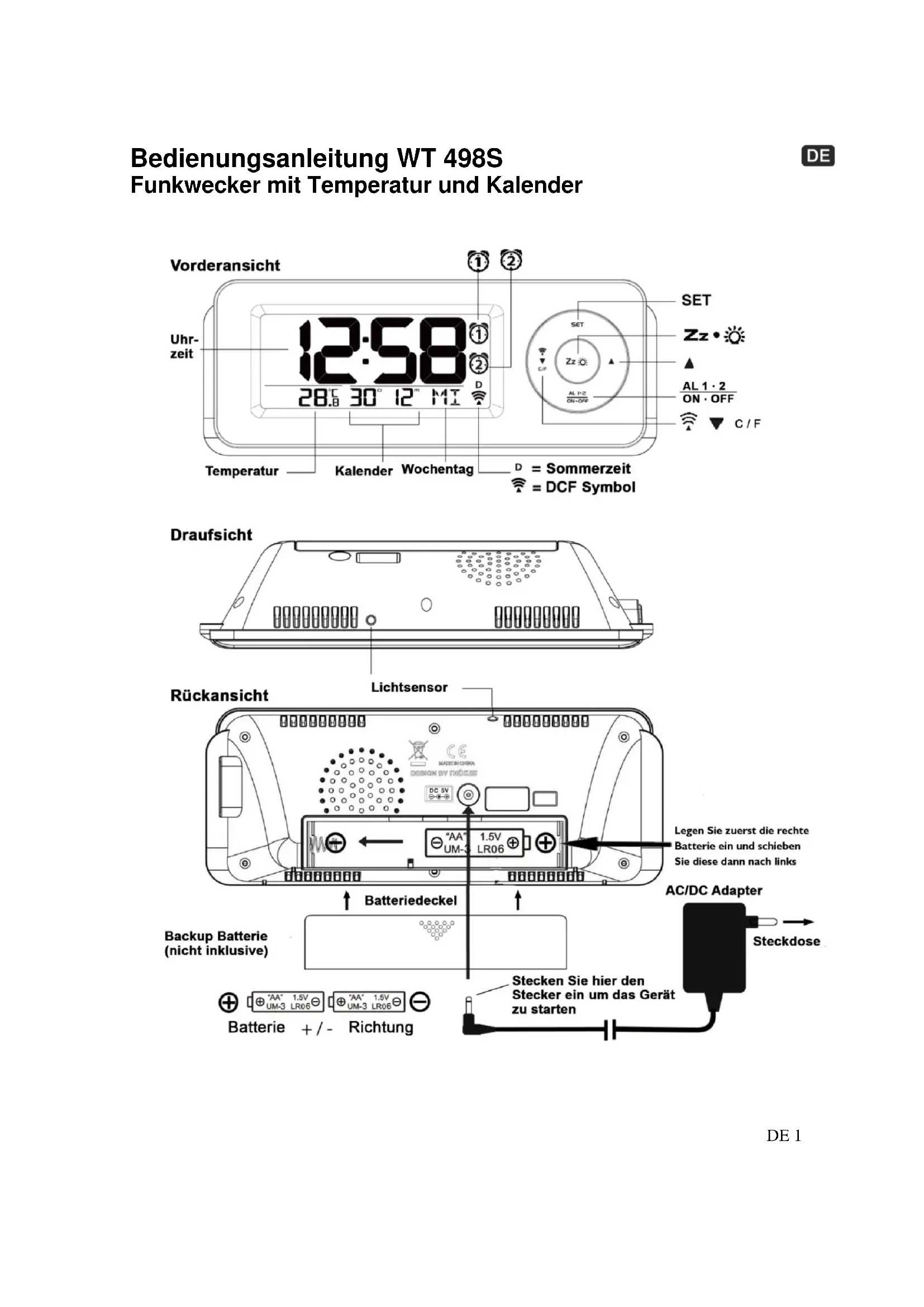 DE 1 Bedienungsanleitung WT 498S Funkwecker mit Temperatur und KalenderDE 2 INSTALLATION Platzieren Sie die Uhr an einer Stelle ohne mögliche Störquellen wie zum Beispiel metallischen Oberflächen und elektrischen Geräten. Schließen Sie den Netzteilstecker an das Gerät an und stecken Sie das Netzteil in eine haushaltsübliche Steckdose. Die Uhr ist betriebsbereit.
