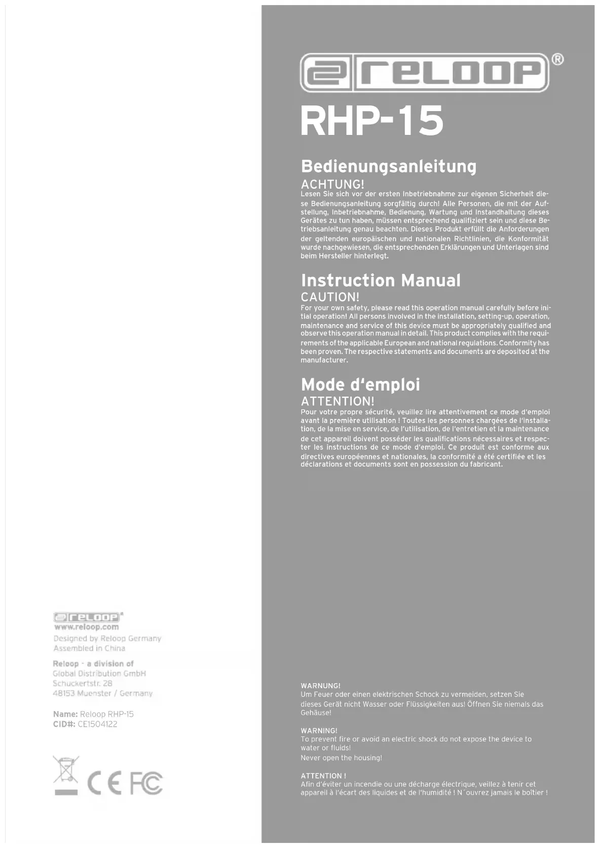 Bedienungsanleitung ACHTUNG! Lesen Sie sich vor der ersten Inbetriebnahme zur eigenen Sicherheit die-se Bedienungsanleitung sorgfältig durch! Alle Personen, die mit der Auf-stellung, Inbetriebnahme, Bedienung, Wartung und Instandhaltung dieses Gerätes zu tun haben, müssen entsprechend qualiziert sein und diese Be-triebsanleitung genau beachten. Dieses Produkt erfüllt die Anforderungen der geltenden europäischen und nationalen Richtlinien, die Konformität wurde nachgewiesen, die entsprechenden Erklärungen und Unterlagen sind beim Hersteller hinterlegt. Instruction Manual CAUTION! For your own safety, please read this operation manual carefully before ini-tial operation! All persons involved in the installation, setting-up, operation, maintenance and service of this device must be appropriately qualied and observe this operation manual in detail. This product complies with the requi-rements of the applicable European and national regulations. Conformity has been proven. The respective statements and documents are deposited at the manufacturer. Mode d‘emploi ATTENTION! Pour votre propre sécurité, veuillez lire attentivement ce mode d‘emploi avant la première utilisation ! Toutes les personnes chargées de l‘installa-tion, de la mise en service, de l‘utilisation, de l‘entretien et la maintenance de cet appareil doivent posséder les qualications nécessaires et respec-ter les instructions de ce mode d‘emploi. Ce produit est conforme aux directives européennes et nationales, la conformité a été certiée et les déclarations et documents sont en possession du fabricant. RHP-15 WARNUNG! Um Feuer oder einen elektrischen Schock zu vermeiden, setzen Sie dieses Gerät nicht Wasser oder Flüssigkeiten aus! Öffnen Sie niemals das Gehäuse! WARNING! To prevent re or avoid an electric shock do not expose the device to water or uids! Never open the housing! ATTENTION ! An d‘éviter un incendie ou une décharge électrique, veillez à tenir cet appareil à l‘écart des liquides et de l‘humidité ! N´ouvrez jamais le boîtier ! Name: Reloop RHP-15