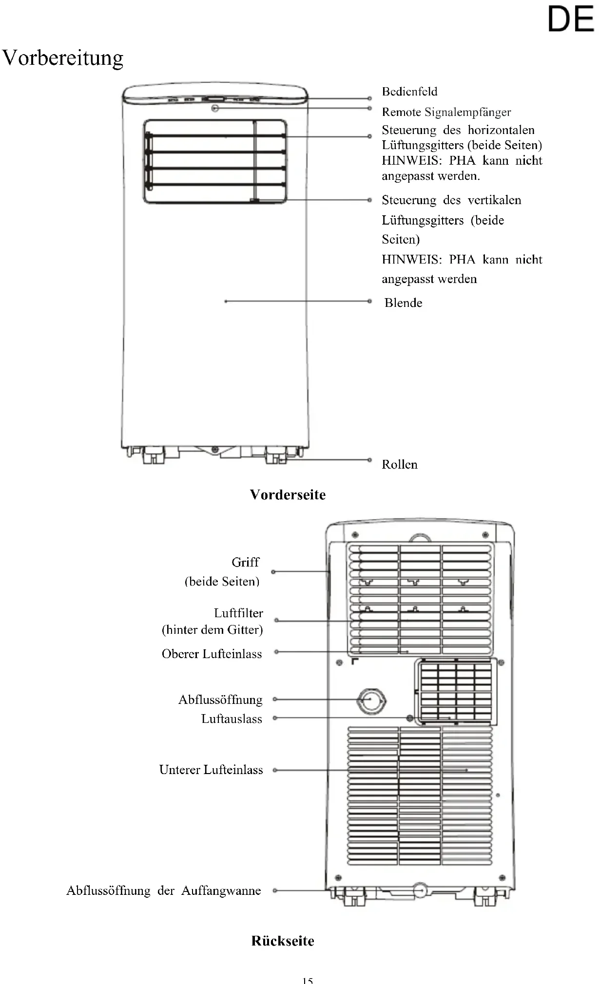 Vielen Dank für den Kauf unseres tragbaren Klimagerätes Lesen Sie bitte diese Bedienungsanleitung vor der Verwendung Ihres Klimagerät sorgfältig durch und bewahren Sie sie zum späteren Nachschlagen auf. DIESE ANLEITUNG LESEN UND AUFBEWAHREN!! DE1 Inhalte Sicherheitshinweise ·········································································· 2 Vorsichtsmaßnahmen ········································································ 4 Warnungen (nur für die Kühlmittel R290/R32) ·········································· 6 Vorbereitungen ················································································ 15 Installation ····················································································· 17 Verwendung ··················································································· 21 Pflege ··························································································· 28 Fehlerdiagnose ················································································ 29 Hinweise zum Design und der Kompatibilität ············································ 30 Soziale Bemerkungen ········································································ 31 DE15 Vorbereitung Vorderseite Rückseite Bedienfeld Remote Signalempfänger Steuerung des horizontalen Lüftungsgitters (beide Seiten) HINWEIS: PHA kann nicht angepasst werden. Steuerung des vertikalen Lüftungsgitters (beide Seiten) HINWEIS: PHA kann nicht angepasst werden Blende Rollen Griff (beide Seiten) Luftfilter (hinter dem Gitter) Oberer Lufteinlass Abflussöffnung Luftauslass Unterer Lufteinlass Abflussöffnung der Auffangwanne DE16 Vorbereitung HINWEIS: Das Gerät, das Sie gekauft haben, könnte aussehen, wie eines der folgenden:
