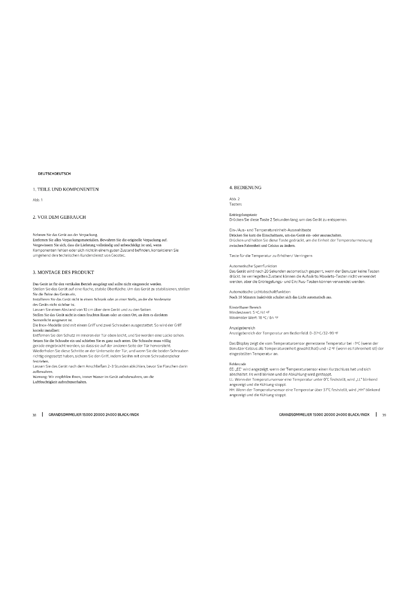 Abb. 2 Tasten: Entriegelungstaste Drücken Sie diese Taste 2 Sekunden lang, um das Gerät zu entsperren. Ein-/Aus- und Temperatureinheit-Auswahltaste Drücken Sie kurz die Einschalttaste, um das Gerät ein- oder auszuschalten. Drücken und halten Sie diese Taste gedrückt, um die Einheit der Temperaturmessung zwischen Fahrenheit und Celsius zu ändern. Taste für die Temperatur zu Erhöhen/ Verringern Automatische Sperrfunktion Das Gerät wird nach 20 Sekunden automatisch gesperrt, wenn der Benutzer keine Tasten drückt. Im verriegelten Zustand können die Aufwärts/Abwärts-Tasten nicht verwendet werden, aber die Entriegelungs- und Ein/Aus-Tasten können verwendet werden. Automatische Lichtabschaltfunktion Nach 10 Minuten Inaktivität schaltet sich das Licht automatisch aus. Einstellbarer Bereich Mindestwert: 5 ºC/41 ºF Maximaler Wert: 18 ºC/ 64 ºF Anzeigebereich Anzeigebereich der Temperatur am Bedienfeld: 0~37ºC/32~99 ºF Das Display zeigt die vom Temperatursensor gemessene Temperatur bei ±1ºC (wenn der Benutzer Celsius als Temperatureinheit gewählt hat) und ±2 ºF (wenn es Fahrenheit ist) der eingestellten Temperatur an. Fehlercode EE: „EE“ wird angezeigt, wenn der Temperatursensor einen Kurzschluss hat und sich abschaltet. Es wird blinken und die Abkühlung wird gestoppt. LL: Wenn der Temperatursensor eine Temperatur unter 0°C feststellt, wird „LL“ blinkend angezeigt und die Kühlung stoppt. HH: Wenn der Temperatursensor eine Temperatur über 37°C feststellt, wird „HH“ blinkend angezeigt und die Kühlung stoppt.4140 DEUTSCH DEUTSCH
