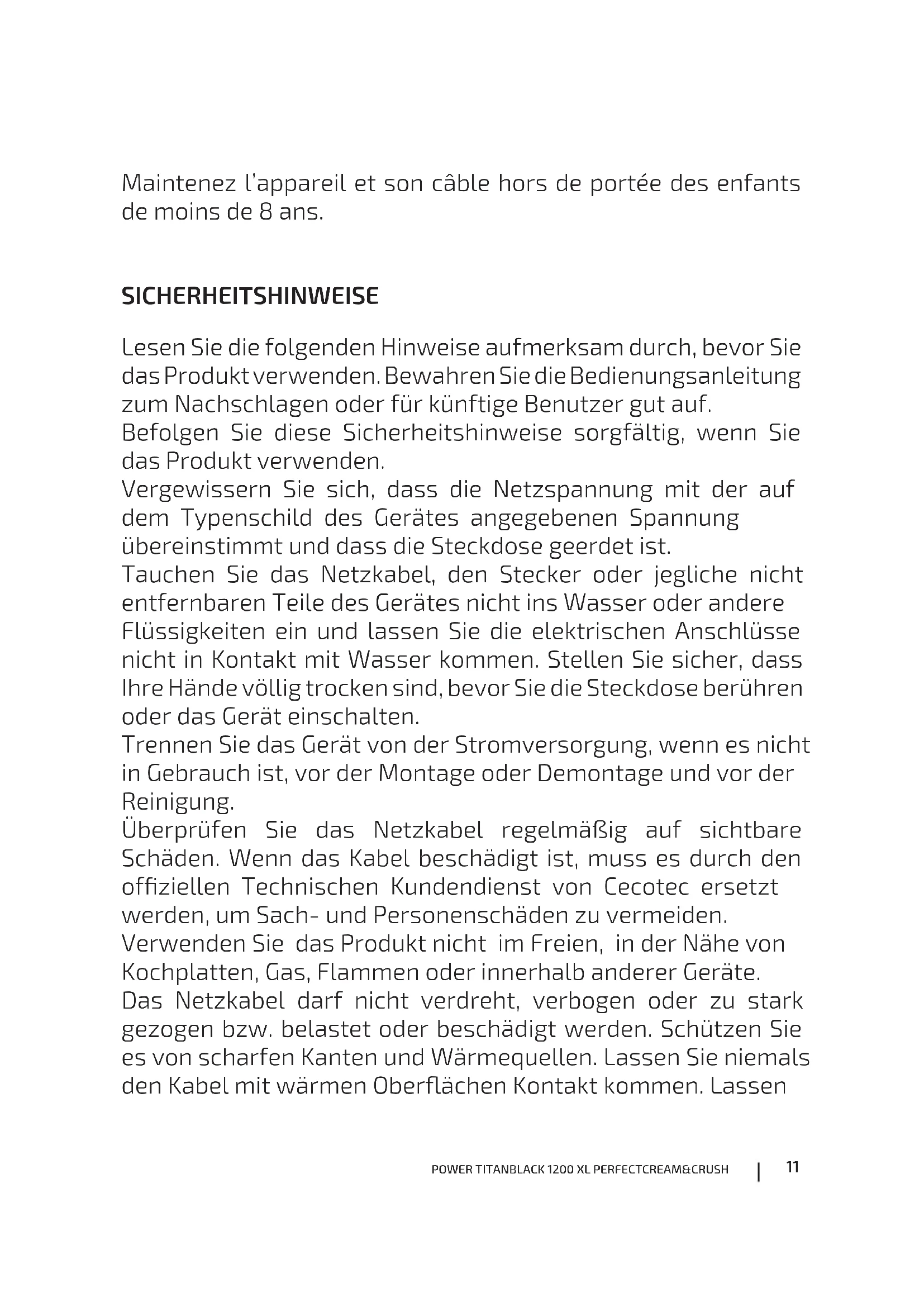 Maintenez l’appareil et son câble hors de portée des enfants de moins de 8 ans. SICHERHEITSHINWEISE Lesen Sie die folgenden Hinweise aufmerksam durch, bevor Sie das Produkt verwenden. Bewahren Sie die Bedienungsanleitung zum Nachschlagen oder für künftige Benutzer gut auf. Befolgen Sie diese Sicherheitshinweise sorgfältig, wenn Sie das Produkt verwenden. Vergewissern Sie sich, dass die Netzspannung mit der auf dem Typenschild des Gerätes angegebenen Spannung übereinstimmt und dass die Steckdose geerdet ist. Tauchen Sie das Netzkabel, den Stecker oder jegliche nicht entfernbaren Teile des Gerätes nicht ins Wasser oder andere Flüssigkeiten ein und lassen Sie die elektrischen Anschlüsse nicht in Kontakt mit Wasser kommen. Stellen Sie sicher, dass Ihre Hände völlig trocken sind, bevor Sie die Steckdose berühren oder das Gerät einschalten. Trennen Sie das Gerät von der Stromversorgung, wenn es nicht in Gebrauch ist, vor der Montage oder Demontage und vor der Reinigung. Überprüfen Sie das Netzkabel regelmäßig auf sichtbare Schäden. Wenn das Kabel beschädigt ist, muss es durch den ofziellen Technischen Kundendienst von Cecotec ersetzt werden, um Sach- und Personenschäden zu vermeiden. Verwenden Sie das Produkt nicht im Freien, in der Nähe von Kochplatten, Gas, Flammen oder innerhalb anderer Geräte. Das Netzkabel darf nicht verdreht, verbogen oder zu stark gezogen bzw. belastet oder beschädigt werden. Schützen Sie es von scharfen Kanten und Wärmequellen. Lassen Sie niemals den Kabel mit wärmen Oberächen Kontakt kommen. LassenPOWER TITANBLACK 1200 XL PERFECTCREAM&CRUSH