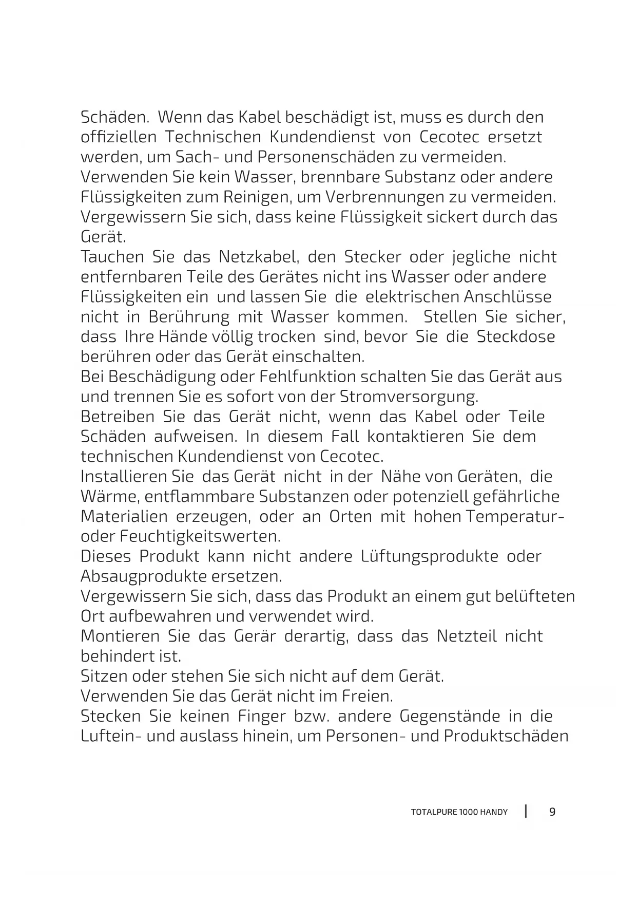 Schäden. Wenn das Kabel beschädigt ist, muss es durch den ofziellen Technischen Kundendienst von Cecotec ersetzt werden, um Sach- und Personenschäden zu vermeiden. Verwenden Sie kein Wasser, brennbare Substanz oder andere Flüssigkeiten zum Reinigen, um Verbrennungen zu vermeiden. Vergewissern Sie sich, dass keine Flüssigkeit sickert durch das Gerät. Tauchen Sie das Netzkabel, den Stecker oder jegliche nicht entfernbaren Teile des Gerätes nicht ins Wasser oder andere Flüssigkeiten ein und lassen Sie die elektrischen Anschlüsse nicht in Berührung mit Wasser kommen. Stellen Sie sicher, dass Ihre Hände völlig trocken sind, bevor Sie die Steckdose berühren oder das Gerät einschalten. Bei Beschädigung oder Fehlfunktion schalten Sie das Gerät aus und trennen Sie es sofort von der Stromversorgung. Betreiben Sie das Gerät nicht, wenn das Kabel oder Teile Schäden aufweisen. In diesem Fall kontaktieren Sie dem technischen Kundendienst von Cecotec. Installieren Sie das Gerät nicht in der Nähe von Geräten, die Wärme, entammbare Substanzen oder potenziell gefährliche Materialien erzeugen, oder an Orten mit hohen Temperatur- oder Feuchtigkeitswerten. Dieses Produkt kann nicht andere Lüftungsprodukte oder Absaugprodukte ersetzen. Vergewissern Sie sich, dass das Produkt an einem gut belüfteten Ort aufbewahren und verwendet wird. Montieren Sie das Gerär derartig, dass das Netzteil nicht behindert ist. Sitzen oder stehen Sie sich nicht auf dem Gerät. Verwenden Sie das Gerät nicht im Freien. Stecken Sie keinen Finger bzw. andere Gegenstände in die Luftein- und auslass hinein, um Personen- und ProduktschädenTOTALPURE 1000 HANDY
