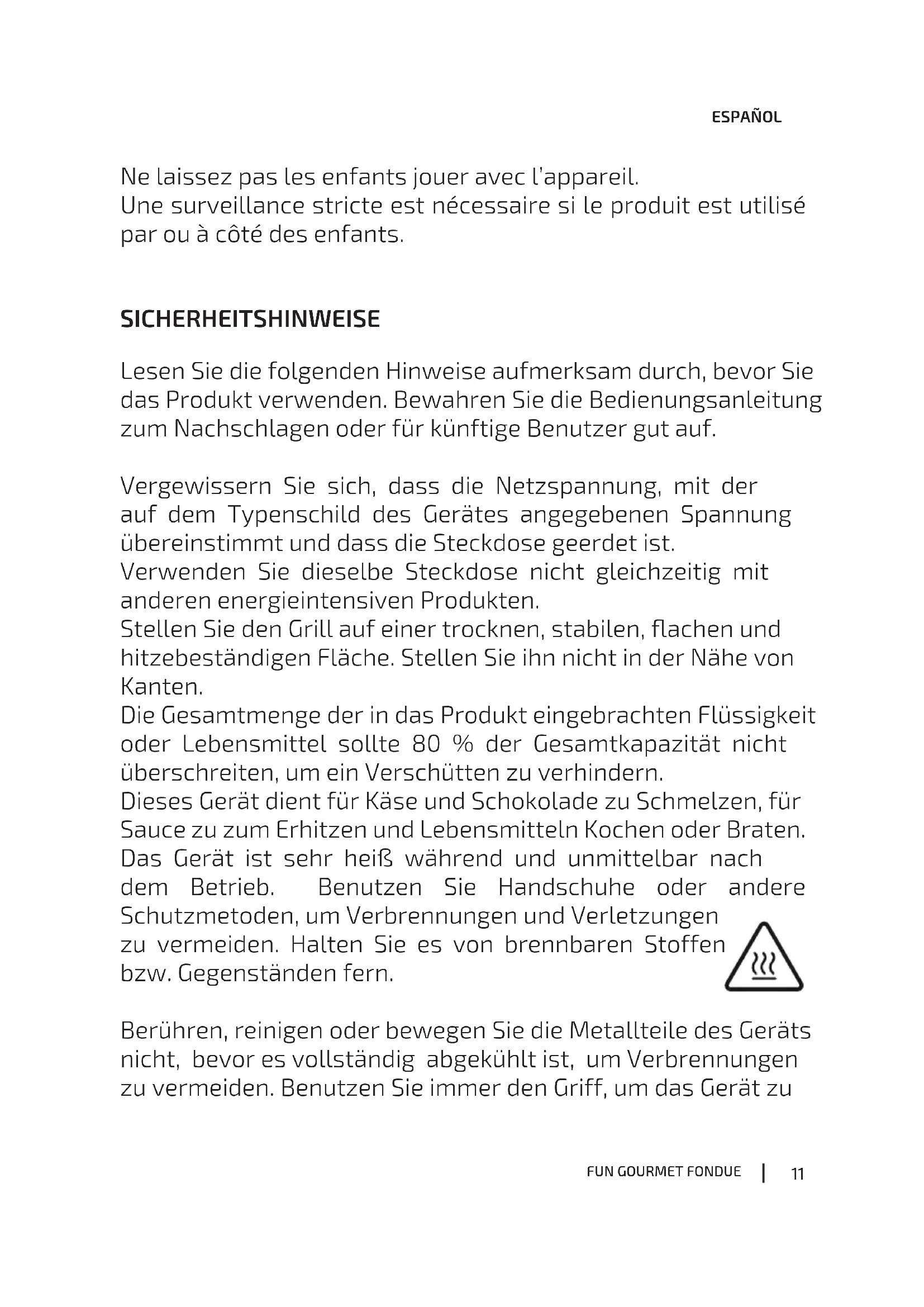 Ne laissez pas les enfants jouer avec l’appareil. Une surveillance stricte est nécessaire si le produit est utilisé par ou à côté des enfants. SICHERHEITSHINWEISE Lesen Sie die folgenden Hinweise aufmerksam durch, bevor Sie das Produkt verwenden. Bewahren Sie die Bedienungsanleitung zum Nachschlagen oder für künftige Benutzer gut auf. Vergewissern Sie sich, dass die Netzspannung, mit der auf dem Typenschild des Gerätes angegebenen Spannung übereinstimmt und dass die Steckdose geerdet ist. Verwenden Sie dieselbe Steckdose nicht gleichzeitig mit anderen energieintensiven Produkten. Stellen Sie den Grill auf einer trocknen, stabilen, achen und hitzebeständigen Fläche. Stellen Sie ihn nicht in der Nähe von Kanten. Die Gesamtmenge der in das Produkt eingebrachten Flüssigkeit oder Lebensmittel sollte 80 % der Gesamtkapazität nicht überschreiten, um ein Verschütten zu verhindern. Dieses Gerät dient für Käse und Schokolade zu Schmelzen, für Sauce zu zum Erhitzen und Lebensmitteln Kochen oder Braten. Das Gerät ist sehr heiß während und unmittelbar nach dem Betrieb. Benutzen Sie Handschuhe oder andere Schutzmetoden, um Verbrennungen und Verletzungen zu vermeiden. Halten Sie es von brennbaren Stoffen bzw. Gegenständen fern. Berühren, reinigen oder bewegen Sie die Metallteile des Geräts nicht, bevor es vollständig abgekühlt ist, um Verbrennungen zu vermeiden. Benutzen Sie immer den Griff, um das Gerät zu12 ESPAÑOL