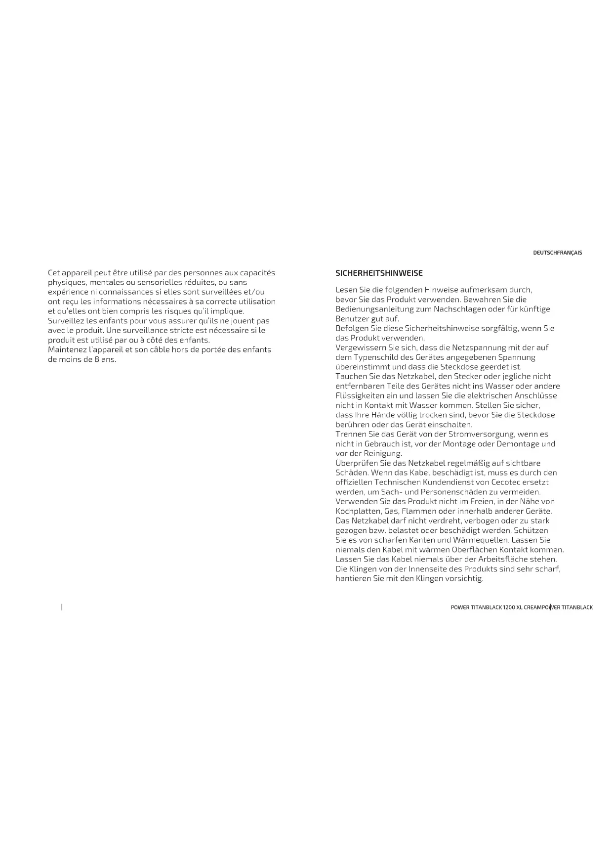 Veuillez lire les instructions suivantes avec attention avant d’utiliser l’appareil. Gardez bien ce manuel pour de futures références ou pour tout nouvel utilisateur. Veuillez suivre ces instructions de sécurité très attentivement lorsque vous utilisez l’appareil. Assurez-vous que le voltage du réseau coïncide avec le voltage spécié sur l’étiquette de classication de l’appareil et que la prise possède une connexion à terre. Ne submergez pas le câble, la prise ni aucune autre partie de l’appareil dans de l’eau ni dans aucun autre liquide, ni n’exposez les connexions électriques à l’eau. Assurez-vous d’avoir les mains complètement sèches avant de toucher la prise ou d’allumer l’appareil. Débranchez l’appareil de la prise de courant avant de le nettoyer, avant de le monter ou démonter, ou si vous n’allez plus l’utiliser. Inspectez le câble d’alimentation régulièrement pour rechercher des dommages visibles. S’il présente des dommages, il doit être réparé par le Service Après-Vente Ofciel de Cecotec pour éviter tout type de danger. N’utilisez pas l’appareil en extérieur, près de plaques électriques ou à gaz, près de ammes ni dans des fours. Ne tordez pas, ne pliez pas, n’étirez pas et n’abîmez pas le câble d’alimentation. Protégez-le des bords pointus et des sources de chaleur. Ne laissez pas le câble toucher les surfaces chaudes. Ne laissez pas le câble dépasser de la surface de travail ou du plan de travail. Les lames à l’intérieur du produit sont très aiguisées, manipulez-les avec soin pour éviter de vous couper. Assurez-vous que le voltage du réseau coïncide avec le voltage spécié sur l’étiquette de classication de l’appareil et que la prise possède une connexion à terre.POWER TITANBLACK 1200 XL CREAMPOWER TITANBLACK 1200 XL CREAM 1312 DEUTSCHFRANÇAIS SICHERHEITSHINWEISE Lesen Sie die folgenden Hinweise aufmerksam durch, bevor Sie das Produkt verwenden. Bewahren Sie die Bedienungsanleitung zum Nachschlagen oder für künftige Benutzer gut auf. Befolgen Sie diese Sicherheitshinweise sorgfältig, wenn Sie das Produkt verwenden. Vergewissern Sie sich, dass die Netzspannung mit der auf dem Typenschild des Gerätes angegebenen Spannung übereinstimmt und dass die Steckdose geerdet ist. Tauchen Sie das Netzkabel, den Stecker oder jegliche nicht entfernbaren Teile des Gerätes nicht ins Wasser oder andere Flüssigkeiten ein und lassen Sie die elektrischen Anschlüsse nicht in Kontakt mit Wasser kommen. Stellen Sie sicher, dass Ihre Hände völlig trocken sind, bevor Sie die Steckdose berühren oder das Gerät einschalten. Trennen Sie das Gerät von der Stromversorgung, wenn es nicht in Gebrauch ist, vor der Montage oder Demontage und vor der Reinigung. Überprüfen Sie das Netzkabel regelmäßig auf sichtbare Schäden. Wenn das Kabel beschädigt ist, muss es durch den ofziellen Technischen Kundendienst von Cecotec ersetzt werden, um Sach- und Personenschäden zu vermeiden. Verwenden Sie das Produkt nicht im Freien, in der Nähe von Kochplatten, Gas, Flammen oder innerhalb anderer Geräte. Das Netzkabel darf nicht verdreht, verbogen oder zu stark gezogen bzw. belastet oder beschädigt werden. Schützen Sie es von scharfen Kanten und Wärmequellen. Lassen Sie niemals den Kabel mit wärmen Oberächen Kontakt kommen. Lassen Sie das Kabel niemals über der Arbeitsäche stehen. Die Klingen von der Innenseite des Produkts sind sehr scharf, hantieren Sie mit den Klingen vorsichtig. Cet appareil peut être utilisé par des personnes aux capacités physiques, mentales ou sensorielles réduites, ou sans expérience ni connaissances si elles sont surveillées et/ou ont reçu les informations nécessaires à sa correcte utilisation et qu’elles ont bien compris les risques qu’il implique. Surveillez les enfants pour vous assurer qu’ils ne jouent pas avec le produit. Une surveillance stricte est nécessaire si le produit est utilisé par ou à côté des enfants. Maintenez l’appareil et son câble hors de portée des enfants de moins de 8 ans.POWER TITANBLACK 1200 XL CREAMPOWER TITANBLACK 1200 XL CREAM 1514 DEUTSCH DEUTSCH Das Gerät darf von Kindern unter 8 Jahren nicht benutzt werden. Dieses Gerät kann von Kindern ab 8 Jahren benutzt werden, wenn sie beaufsichtigt werden. Dieses Produkt kann von Kindern ab 8 Jahren und Personen mit eingeschränkten körperlichen, sensorischen oder geistigen Fähigkeiten oder mit mangelnder Erfahrung und Kenntnissen verwendet werden, wenn sie in der sicheren Anwendung des Geräts beaufsichtigt oder unterwiesen werden und die damit verbundenen Risiken verstehen. Beaufsichtigen Sie Kinder, um zu verhindern, dass sie mit dem Gerät spielen. Eine besondere genaue und konsequente Beaufsichtigung ist geboten, wenn das Gerät in der Nähe von Kindern verwendet wird. Bewahren Sie das Gerät auberhalb der Reichweite von Kinder unter 8 Jahre auf. Vergewissern Sie sich, dass die Netzspannung, mit der auf dem Typenschild des Gerätes angegebenen Spannung übereinstimmt und dass die Steckdose geerdet ist. Schließen Sie das Gerät erst dann an die Stromversorgung an, wenn alle Teile zusammengebaut sind, und vergewissern Sie sich, dass der Netzstecker ausgezogen ist, bevor Sie Teile entfernen oder die Klinge handhaben. Geben Sie keine heißen Zutaten in das Gerät ein. Dieses Produkt ist nur zur Nutzung in privaten Haushalt bestimmt. Verwenden Sie den Mixer nicht länger als 1 Minute und verarbeiten Sie harte Lebensmittel nicht länger als 10 Sekunden auf einmal. Fügen Sie keine Gegenstände in den Produkt beim Betrieb hinzu, um Schäden und Verletzungen zu verhindern. Seien Sie vorsichtig. Seien Sie besonders vorsichtig mit den Klingen beim Entleeren des Behälters und beim Reinigen des Produkts. Dieses Produkt kann von Kindern ab 8 Jahren und Personen mit eingeschränkten körperlichen, sensorischen oder geistigen Fähigkeiten oder mit mangelnder Erfahrung und Kenntnissen verw