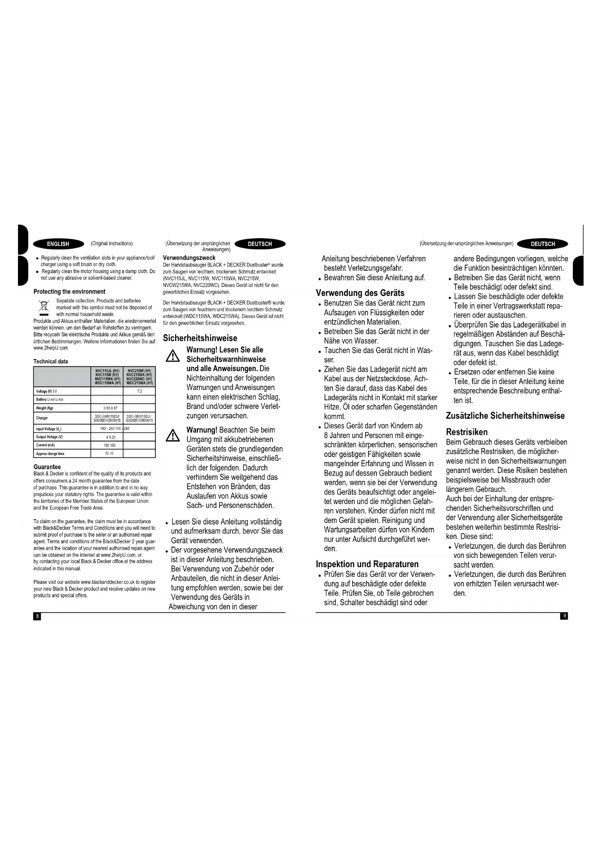 u Verletzungen, die durch das Aus- tauschen von Teilen oder Zubehör verursacht werden. u Verletzungen, die durch längeren Ge- brauch des Geräts verursacht werden. Legen Sie bei längerem Gebrauch regelmäßige Pausen ein. Akkus und Ladegeräte Akkus u Keinesfalls versuchen, den Akku zu öffnen. u Achten Sie darauf, dass der Akku nicht mit Wasser in Berührung kommt. u Setzen Sie den Akku keinen hohen Temperaturen aus. u Nicht bei Temperaturen über 40°C lagern. u Laden Sie den Akku ausschließlich bei Umgebungstemperaturen zwischen 10 °C und 40 °C. u Verwenden Sie ausschließlich das mit dem Gerät gelieferte Ladegerät. Das Verwenden eines falschen La- degeräts kann zu einem Stromschlag oder dem Überhitzen des Akkus führen. u Bei der Entsorgung von Akkus oder Batterien die Hinweise im Abschnitt "Umweltschutz" beachten. u Der Akku darf nicht durch mechani- sche Krafteinwirkung oder Belastun- gen beschädigt oder verformt werden. Andernfalls besteht Verletzungs- und Brandgefahr. u Laden Sie beschädigte Akkus nicht auf. u Unter extremen Bedingungen können Akkus undicht werden. Wenn Sie fest- stellen, dass aus dem Akku Flüssigkeit austritt, wischen Sie diese vorsichtig mit einem Tuch ab. Vermeiden Sie Hautkontakt. u Beachten Sie nach Haut- oder Augen- kontakt die folgenden Hinweise. Warnung! Batteriesäure kann Sach- oder Personenschäden verursachen. Spülen Sie die Säure bei Hautkontakt sofort mit Wasser ab. Suchen Sie einen Arzt auf, wenn sich auf der Haut Rötungen, Rei- zungen oder andere Irritationen zeigen. Spülen Sie das Auge nach Augenkontakt sofort mit sauberem Wasser aus, und suchen Sie einen Arzt auf. Ladegeräte Das Ladegerät ist für eine bestimmte Spannung ausgelegt. Stellen Sie sicher, dass die Netzspannung der auf dem Ty- penschild des Geräts und in der Tabelle mit den technischen Daten angegebenen Spannung entspricht. Warnung! Ersetzen Sie das Ladegerät keinesfalls durch ein normales Netzkabel. u Verwenden Sie das BLACK + DE- CKER Ladegerät nur für den Akku des Geräts, mit dem es geliefert wurde. Andere Akkus können platzen und Sachschäden oder Verletzungen ver- ursachen. u Versuchen Sie keinesfalls, nicht auf- ladbare Batterien zu laden. u Bei einer Beschädigung des Netzka- bels muss dieses durch den Hersteller oder eine BLACK+DECKER Vertragswerkstatt ausgetauscht wer- den, um mögliche Gefahren zu vermei- den. u Achten Sie darauf, dass das Ladegerät nicht mit Wasser in Berührung kommt. u Versuchen Sie nicht, das Ladegerät zu öffnen. u Nehmen Sie am Ladegerät keine Veränderungen vor. u Beim Laden des Geräts/Akkus muss auf ausreichende Belüftung geachtet werden. Elektrische Sicherheit Das Ladegerät ist für eine bestimmte Spannung ausgelegt. Stellen Sie sicher, dass die Netzspannung der auf dem Typenschild des Geräts angegebenen Spannung entspricht. Ersetzen Sie das Ladegerät keinesfalls durch ein normales Netzkabel. Symbole auf dem Ladegerät Lesen Sie diese Anleitung vollständig und aufmerksam durch, bevor Sie das Gerät verwenden. Dieses Gerät ist schutzisoliert, daher ist keine Erdleitung erforderlich. Überprüfen Sie immer, dass die Stromversor- gung der Spannung auf dem Typenschild entspricht. Die Ladestation darf nur im In- nenbereich verwendet werden. Warnsymbole am Gerät Am Gerät befinden sich folgende Warnsymbole inkl. Datums-code:NVC115JL/NVC115W/NVC115WA/ WDC115WA Nur mit folgendem Ladegerät verwenden: SSC-040015EU/ S003BDV0500015NVC215W/NVC215WA/NVC220WC/ WDC215WA Nur mit folgendem Ladegerät verwenden: SSC-080015EU/ S003BEV0800015 Merkmale Dieses Gerät verfügt über einige oder alle der folgenden Merkmale: 1. Ein-/Aus-Schalter 2. Entriegelungstaste für den Auffangbehälter 3. Staubbehälter 4. Ladestation (nur Modell NVC115W, NVC115WA, NVC215W, NVC215WA, NVC220WC, WDC115WA, WDC215WA). 4a. Stecker des Ladegeräts (nur Modell NVC115JL). 5. Einziehbare Fugendüse (nur NVC215W, NVC215WA NVC220WC) 6. Bürste (nur NVC115WA, NVC215WA, NVC220WC, WDC115WA und WDC215WA) 7. Fugendüse (nur NVC115WA) 8. Gummiwischer (nur Modell WDC115WA und WDC215WA) Abb. A 10. Stofflter zum Trockensaugen (nur NVC-Geräte) 11. Vorlter (nur NVC-Geräte) 12. Schaumstoffeinsatz zum Nass-/Trockensaugen (nur WDC-Geräte)13. Deektor zum Nass-/Trockensaugen (nur WDC-Geräte) Installation Wandmontage (nur Modell NVC115W, NVC115WA, NVC215W, NVC215WA, NVC220WC, WDC115WA, WD-C215WA). (Abb. B)Das Gerät kann so an einer Wand befestigt werden, dass ein bequem erreichbarer Ort zum Aufbewahren und Laden des Geräts zur Verfügung steht.Achten Sie bei der Wandmontage darauf, dass die gewählten Befestigungsmittel für den jeweiligen Wandbaustoff geeignet sind und das Gerätegewicht tragen können.uMarkieren Sie die Position der Schraubenlöcher (in Reich-weite einer Steckdose, damit der Staubsauger aufgeladen werden kann, während er an der Wand angebracht ist).uBefestigen Sie die Aufhängvorrichtung mithilfe von für Wandtyp und Gerätegewicht geeigneten Schrauben und Dübeln an der Wand.SSC-040015EU/ S003DV0500015 S003AQ 15