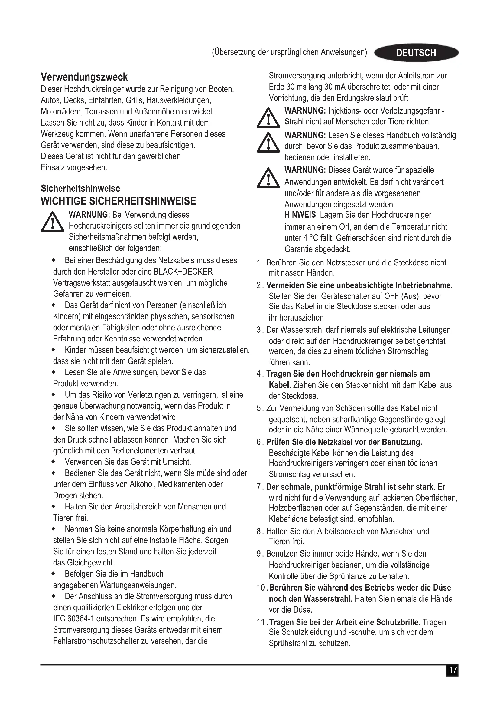 WARNUNG: Bei Verwendung dieses Hochdruckreinigers sollten immer die grundlegenden Sicherheitsmaßnahmen befolgt werden, einschließlich der folgenden: Bei einer Beschädigung des Netzkabels muss dieses durch den Hersteller oder eine BLACK+DECKER Vertragswerkstatt ausgetauscht werden, um mögliche Gefahren zu vermeiden. Das Gerät darf nicht von Personen (einschließlich Kindern) mit eingeschränkten physischen, sensorischen oder mentalen Fähigkeiten oder ohne ausreichende Erfahrung oder Kenntnisse verwendet werden. Kinder müssen beaufsichtigt werden, um sicherzustellen, dass sie nicht mit dem Gerät spielen. Lesen Sie alle Anweisungen, bevor Sie das Produkt verwenden. Um das Risiko von Verletzungen zu verringern, ist eine genaue Überwachung notwendig, wenn das Produkt in der Nähe von Kindern verwendet wird. Sie sollten wissen, wie Sie das Produkt anhalten und den Druck schnell ablassen können. Machen Sie sich gründlich mit den Bedienelementen vertraut. Verwenden Sie das Gerät mit Umsicht. Bedienen Sie das Gerät nicht, wenn Sie müde sind oder unter dem Einuss von Alkohol, Medikamenten oder Drogen stehen. Halten Sie den Arbeitsbereich von Menschen und Tieren frei. Nehmen Sie keine anormale Körperhaltung ein und stellen Sie sich nicht auf eine instabile Fläche. Sorgen Sie für einen festen Stand und halten Sie jederzeit das Gleichgewicht. Befolgen Sie die im Handbuch angegebenen Wartungsanweisungen. Der Anschluss an die Stromversorgung muss durch einen qualizierten Elektriker erfolgen und der IEC 60364‑1 entsprechen. Es wird empfohlen, die Stromversorgung dieses Geräts entweder mit einem Fehlerstromschutzschalter zu versehen, der die Stromversorgung unterbricht, wenn der Ableitstrom zur Erde 30 ms lang 30 mA überschreitet, oder mit einer Vorrichtung, die den Erdungskreislauf prüft.