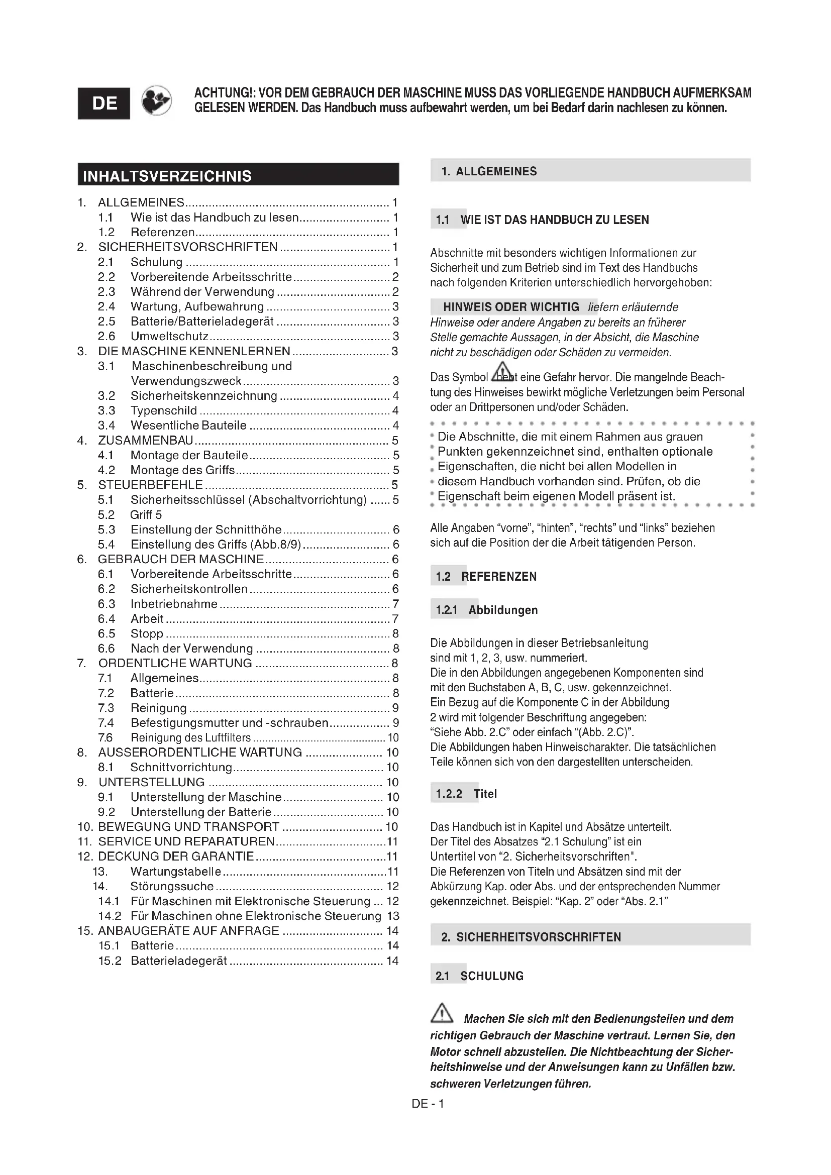 Machen Sie sich mit den Bedienungsteilen und dem richtigen Gebrauch der Maschine vertraut. Lernen Sie, den Motor schnell abzustellen. Die Nichtbeachtung der Sicher- heitshinweise und der Anweisungen kann zu Unfällen bzw. schweren Verletzungen führen. ACHTUNG!: VOR DEM GEBRAUCH DER MASCHINE MUSS DAS VORLIEGENDE HANDBUCH AUFMERKSAM GELESEN WERDEN. Das Handbuch muss aufbewahrt werden, um bei Bedarf darin nachlesen zu können.