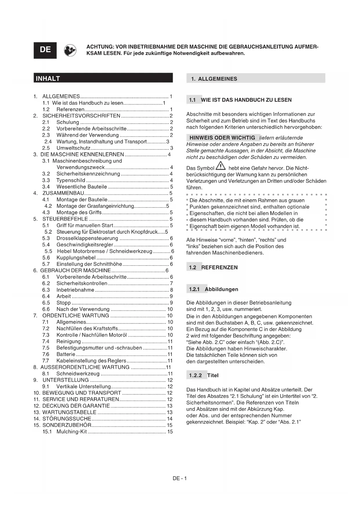 Eingri Regelmäßigkeit Hinweise MASCHINE Kontrolle aller Befestigungen Vor jeder Verwendung Abs. 7.5 Sicherheitskontrollen / Überprüfung der Befehle (einschließlich des Operator Presence Control - Hebels) Vor jeder Verwendung Abs. 6.2 Kontrolle des hinteren Auswurfschutzes / seitlichen Auswurfschutzes. Vor jeder Verwendung Abs. 6.2.1 Überprüfung von Grasfangeinrichtung und seitlichem Auswurfdeektor. Vor jeder Verwendung Abs. 6.2.1 Überprüfung des Schneidwerkzeugs Vor jeder Verwendung Abs. 6.2.1DE - 14 Allgemeine Reinigung und Kontrolle Bei jedem Verwendungsende Abs. 7.4 Kontrolle von eventuellen Schäden an der Maschine. Wenn notwendig, das autorisierte Kundendienstzentrum kontaktieren. Bei jedem Verwendungsende - Kabeleinstellung des Reglers ** Abs. 7.7 Austausch des Schneidwerkzeugs - Abs. 8.1 *** MOTOR Kontrolle/Nachfüllen des Kraftstoniveaus Vor jeder Verwendung Abs. 6.1.1 / 7.2 * Kontrolle / Nachfüllen Motoröl Vor jeder Verwendung Abs. 6.1.1 / 7.3 * Kontrolle und Reinigung des Luftlters * * Kontrolle und Reinigung der Kontakte der Zündkerze * * Auswechseln Zündkerze * * Batterieladung * Abs. 7.6 * * Das Motorhandbuch zu Rate ziehen. ** Arbeitsschritt muss bei den ersten Anzeichen einer Fehlfunktion ausgeführt werden. *** Dieser Arbeitsschritt muss von Ihrem Händler oder einem Fachbetrieb ausgeführt werden.