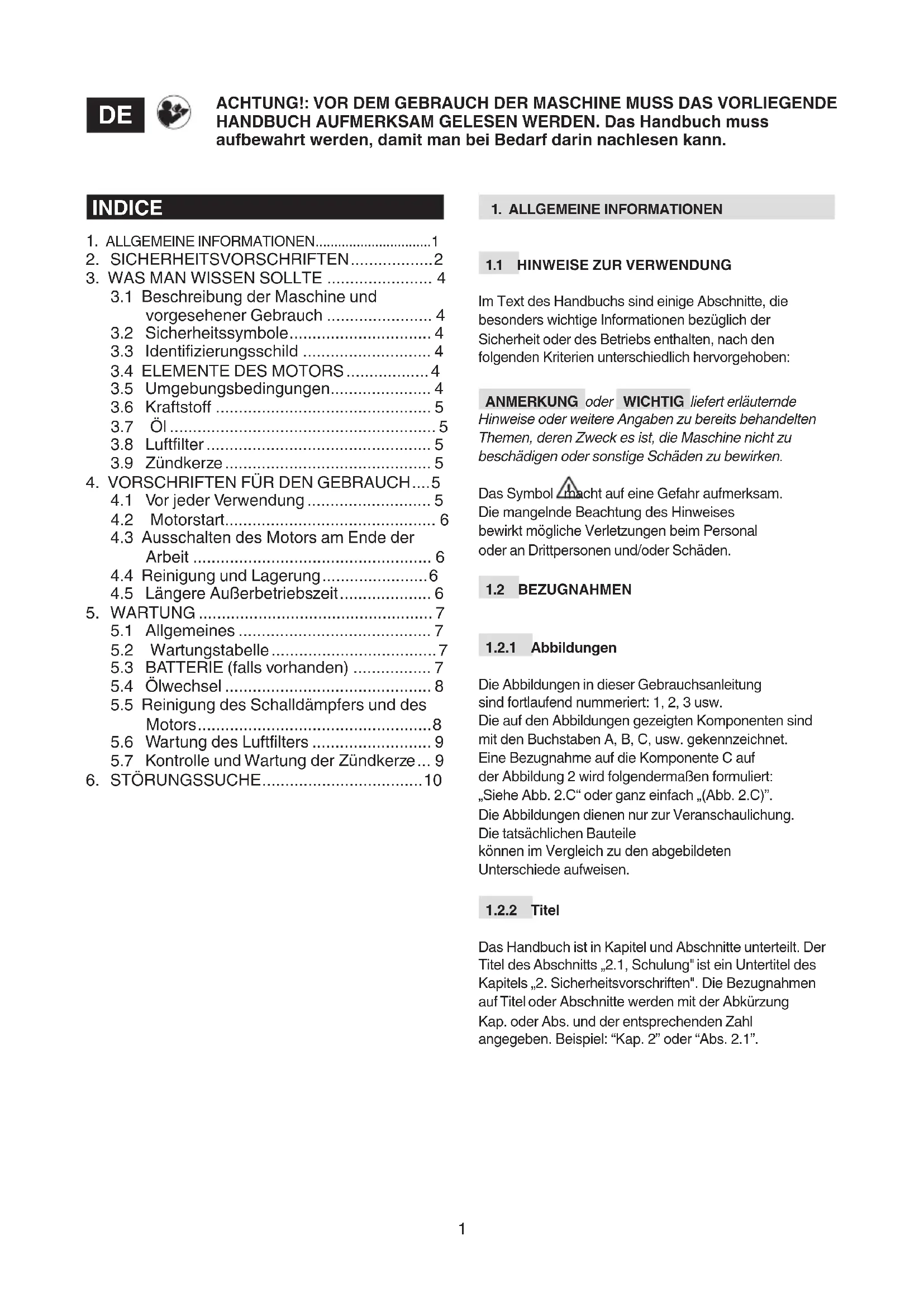 Diese Maschine ist ein Verbrennungsmotor. Bei einem Motor handelt es sich um ein Gerät, dessen Leistung, gleichmäßiger Betrieb und Lebensdauer von vielen Faktoren abhängen, einige davon sind externe Faktoren, andere hängen eng mit der Qualität der verwendeten Produkte und der regelmäßigen Wartung zusammen. Nachfolgend einige zusätzliche Informationen, die einen zielbewussteren Umgang mit dem Motor ermöglichen. Jede Verwendung, die von den oben angegebenen abweicht, kann gefährlich sein und Schäden an Personen und/oder Sachen bewirken. WICHTIG Ein nicht zweckmäßiger Gebrauch der Maschine bewirkt den Verfall der Garantie, wobei der Hersteller jede Haftung ablehnt und alle durch Schäden oder Verletzungen an der eigenen Person oder an Drittpersonen entstehenden Verpichtungen dem Benutzer zuschreibt.