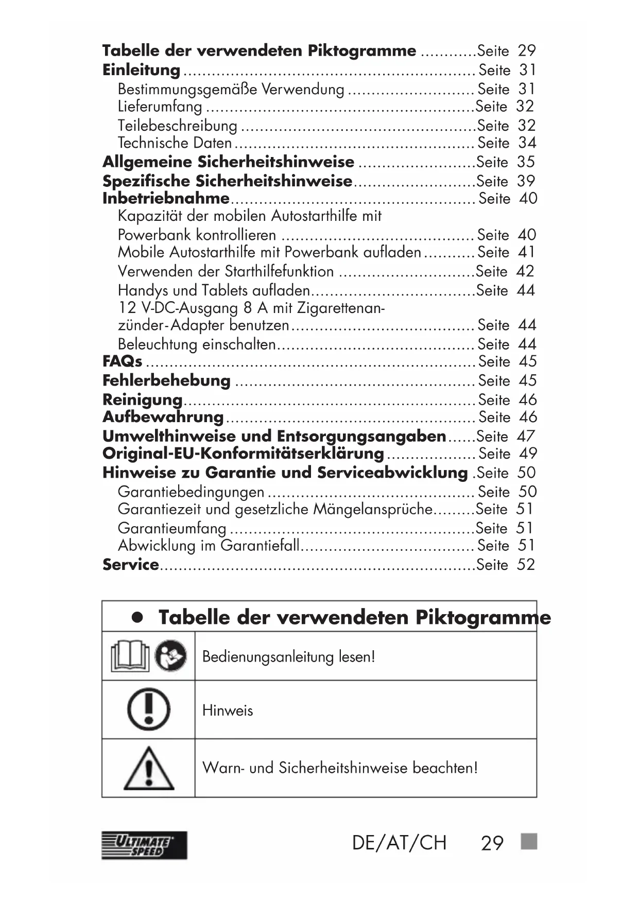 z Tabelle der verwendeten Piktogramme Bedienungsanleitung lesen! Hinweis Warn- und Sicherheitshinweise beachten! Tabelle der verwendeten Piktogramme ............Seite 29 Einleitung .............................................................. Seite 31 Bestimmungsgemäße Verwendung ........................... Seite 31 Lieferumfang .........................................................Seite 32 Teilebeschreibung ..................................................Seite 32 Technische Daten ...................................................Seite 34 Allgemeine Sicherheitshinweise .........................Seite 35 Spezifische Sicherheitshinweise ..........................Seite 39 Inbetriebnahme ....................................................Seite 40 Kapazität der mobilen Autostarthilfe mit Powerbank kontrollieren ......................................... Seite 40 Mobile Autostarthilfe mit Powerbank aufladen ........... Seite 41 Verwenden der Starthilfefunktion .............................Seite 42 Handys und Tablets aufladen...................................Seite 44 12 V-DC-Ausgang 8 A mit Zigarettenan- zünder - Adapter benutzen .......................................Seite 44 Beleuchtung einschalten ..........................................Seite 44 FAQs ......................................................................Seite 45 Fehlerbehebung ................................................... Seite 45 Reinigung ..............................................................Seite 46 Aufbewahrung .....................................................Seite 46 Umwelthinweise und Entsorgungsangaben ......Seite 47 Original-EU-Konformitätserklärung ................... Seite 49 Hinweise zu Garantie und Serviceabwicklung .Seite 50 Garantiebedingungen ............................................ Seite 50 Garantiezeit und gesetzliche Mängelansprüche .........Seite 51 Garantieumfang ....................................................Seite 51 Abwicklung im Garantiefall .....................................Seite 51 Service...................................................................Seite 5230 DE/AT/CH Die LED-Lampe ist nicht zur Raumbeleuchtung im Haushalt geeignet. -21°C Die LED-Lampe ist geeignet für extreme Temperaturen bis -21°C. Schutzklasse III Das Gerät ist nur für den Betrieb im Innenbereich geeignet.